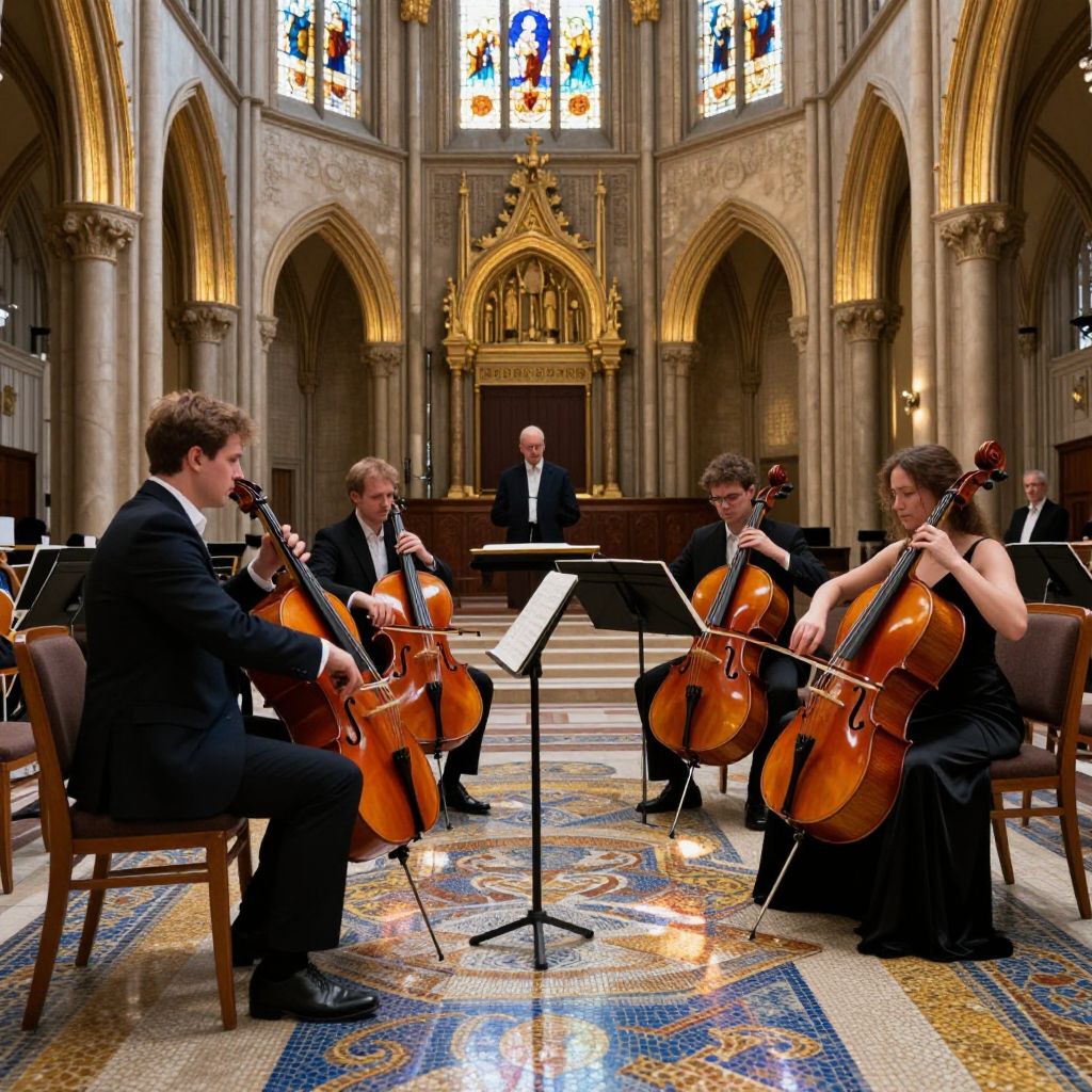 Photograph of a string quartet performing in a grand, ornate cathedral. Four male musicians, dressed in black suits, are seated in a semi-circle on wooden chairs, each playing a deep-brown, polished cello. The quartet is positioned in front of a beautifully detailed altar with a golden, ornate design and surrounded by tall, arched columns. Stained glass windows with vibrant colors are visible at the top, casting a warm light over the scene. Music stands with sheet music are placed in front of each cellist, and the intricately patterned, mosaic-tiled floor reflects the light.