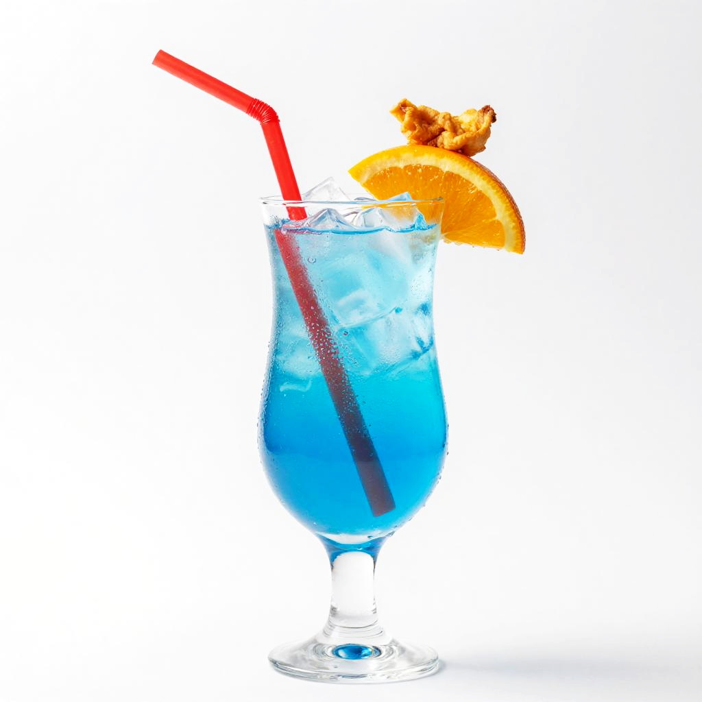 A vibrant blue tropical cocktail in a frosted glass with condensation, featuring a frothy white top. Garnished with a bright red maraschino cherry, an orange slice, and an orange paper umbrella decorated with green floral patterns. A black straw is placed inside the drink. The image is set against a plain white background, highlighting the refreshing and colorful nature of the beverage.