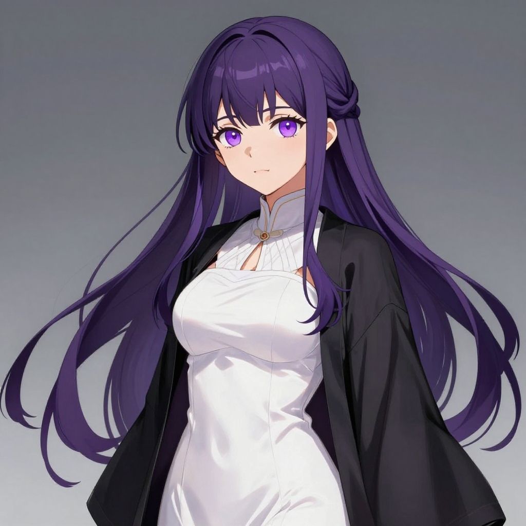 Masterpiece, best quality, absurdres, perfect anatomy, 1girl, solo, FernFrieren, very long hair, purple eyes, (purple pupils), white dress, black robe, large breasts