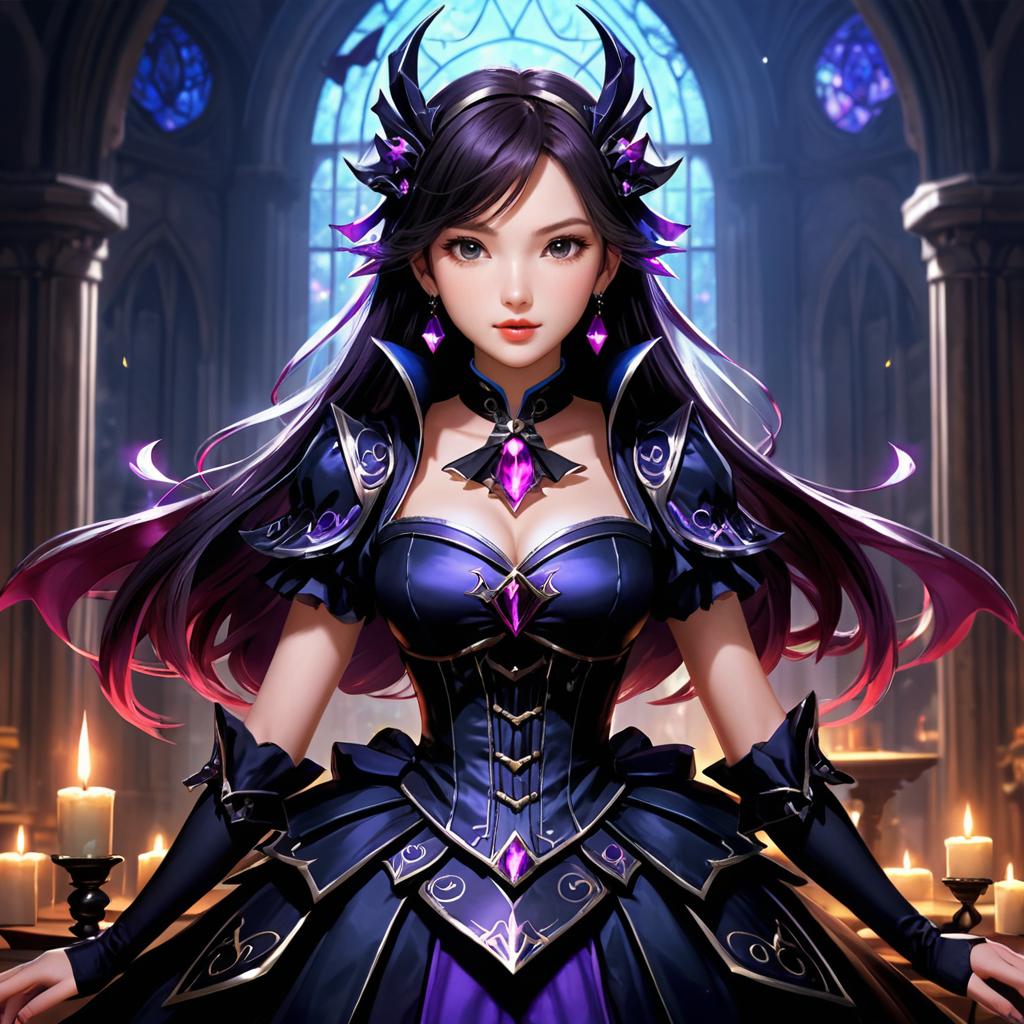 This digital artwork depicts an ethereal East Asian woman with long, flowing black hair and piercing blue eyes. She wears a white, form-fitting dress with deep cleavage, adorned with purple floral patterns and black, sleeveless, high-collared cape. Her skin is fair, and she has a delicate, almost otherworldly beauty. A purple flower adorns her hair. The background features an arched, luminous white window, adding a celestial feel. Soft, purple, mist-like energy surrounds her, enhancing the magical atmosphere. The image is highly detailed, with a fantasy art style.