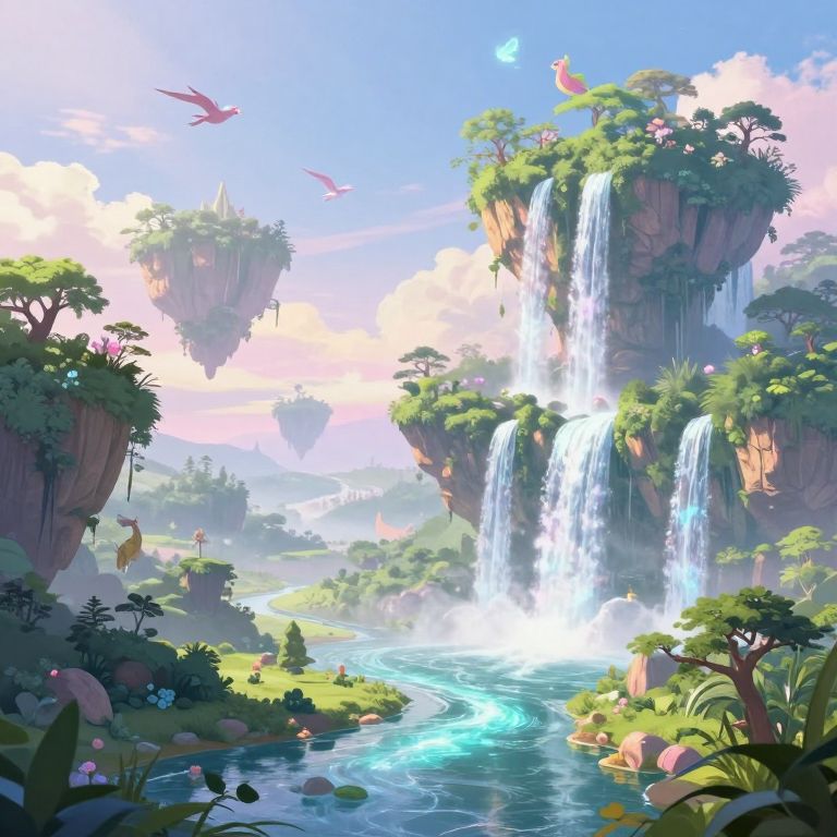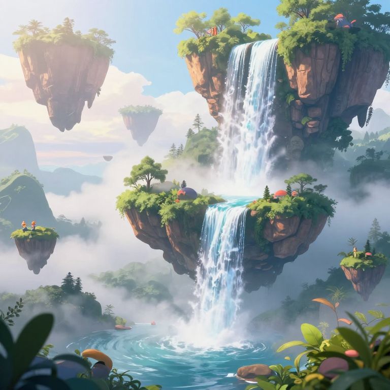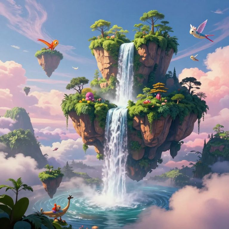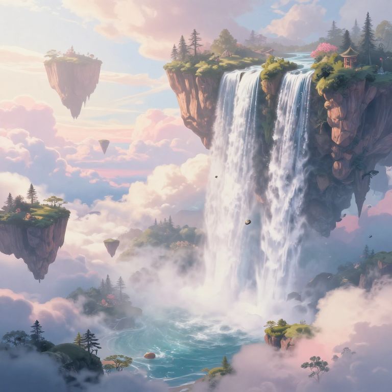 Eniu, a surreal dreamscape featuring floating islands covered with lush greenery and waterfalls cascading into a cosmic void, pastel clouds swirling around, mystical creatures flying in the sky, vibrant and imaginative scene with soft lighting and deep shadows.