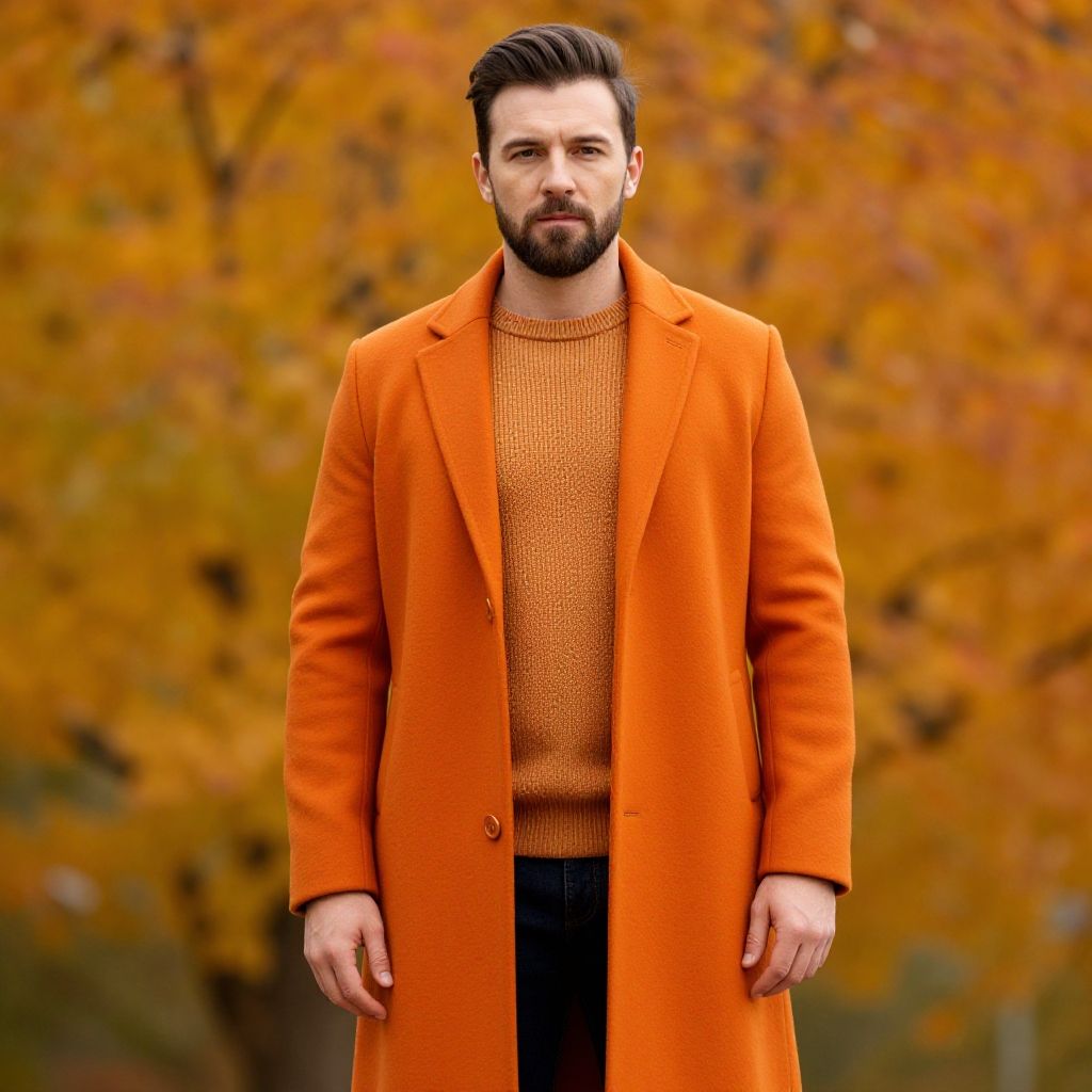 A stylish man stands confidently against a backdrop of vibrant autumn leaves, wearing a striking orange coat and a cozy sweater. The warm color palette and soft lighting enhance the inviting atmosphere of the scene, making it a perfect representation of fall fashion.