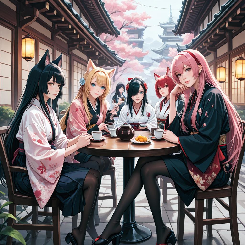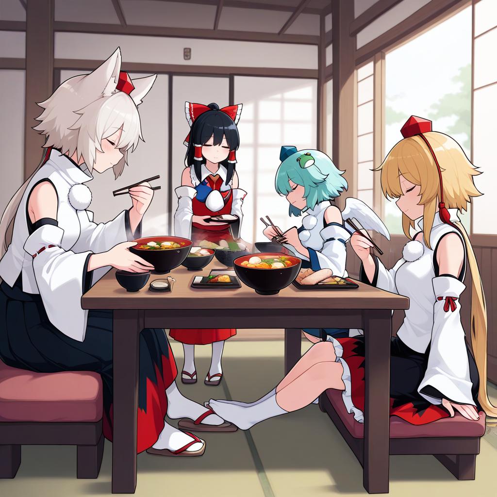 Digital artwork of four female anime characters sitting around a wooden table enjoying a variety of traditional Japanese dishes including ramen and miso soup in a bright room with large windows and greenery outside. Characters feature distinct styles including green hair with angel wings, blonde hair with bunny ears, and traditional Japanese attire with red bows.