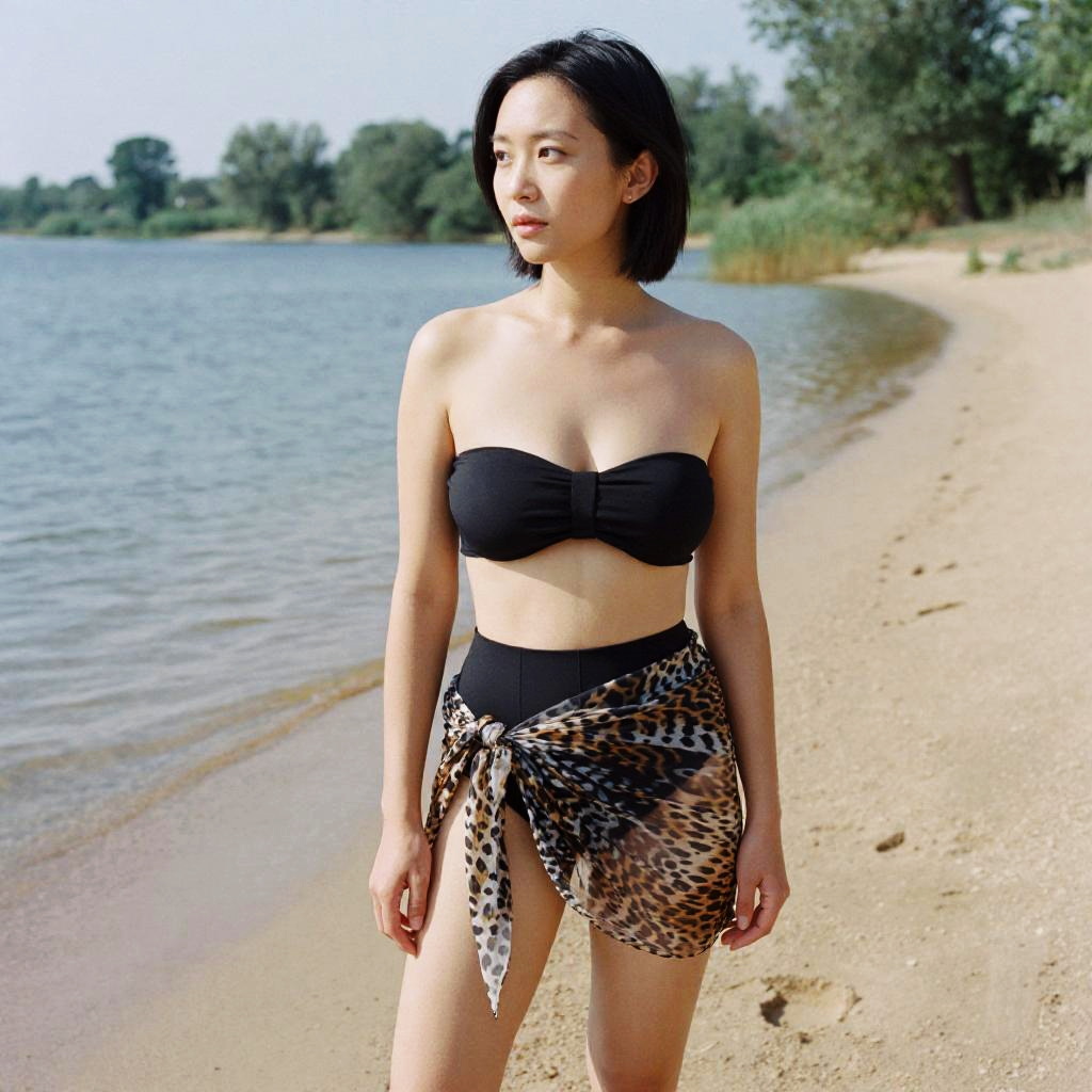 A woman in a minimalist summer style, wearing a black bandeau bikini top and matching high-waisted bikini bottoms, with a sheer animal print sarong draped at the waist, enjoying a serene lakeside by a lagoon with a sandy beach, captured in the vibrant tones of kodachrome analog film. Sexy. Pretty face and beаutiful eyes. Big breasts
