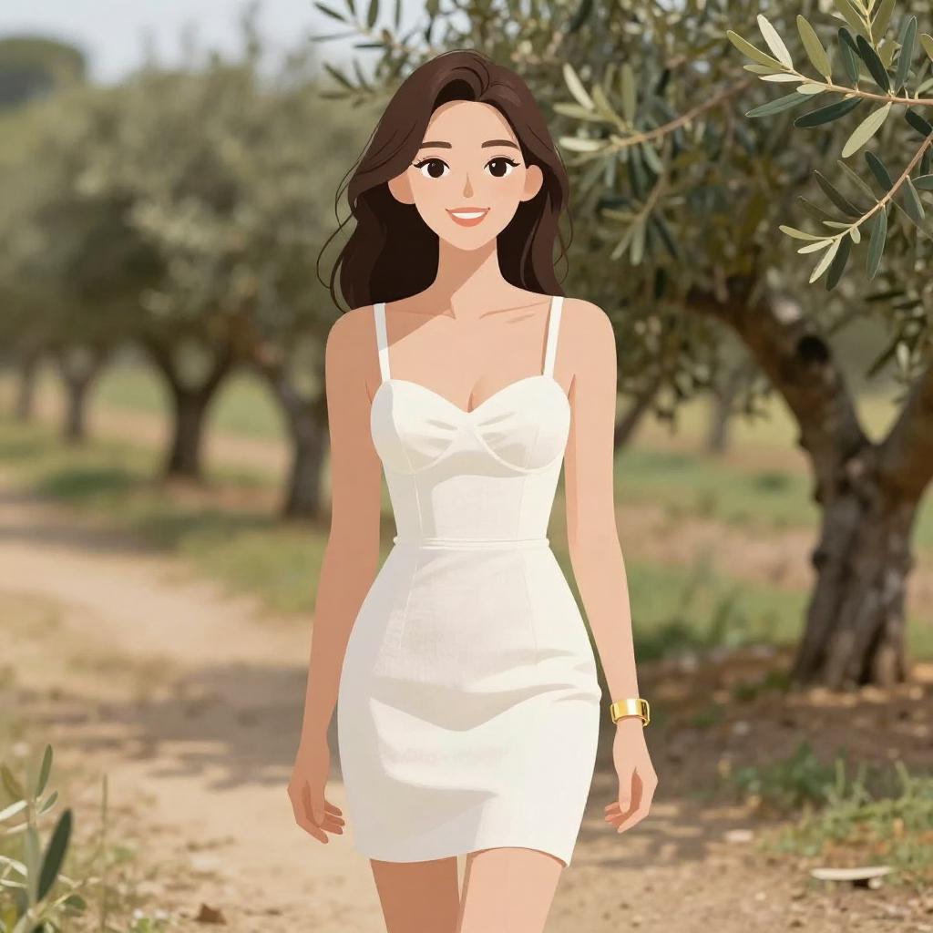 This digital drawing depicts a young woman with long, wavy dark brown hair and fair skin, standing in an olive grove. She is smiling, with large, expressive brown eyes and wearing a form-fitting, sleeveless white dress that accentuates her slender physique and small to medium-sized breasts. She has a gold bracelet on her left wrist. The background features blurred olive trees with green leaves and a sunlit, dirt path. The overall style is semi-realistic with a slight cartoonish touch, characterized by smooth lines and vibrant colors.