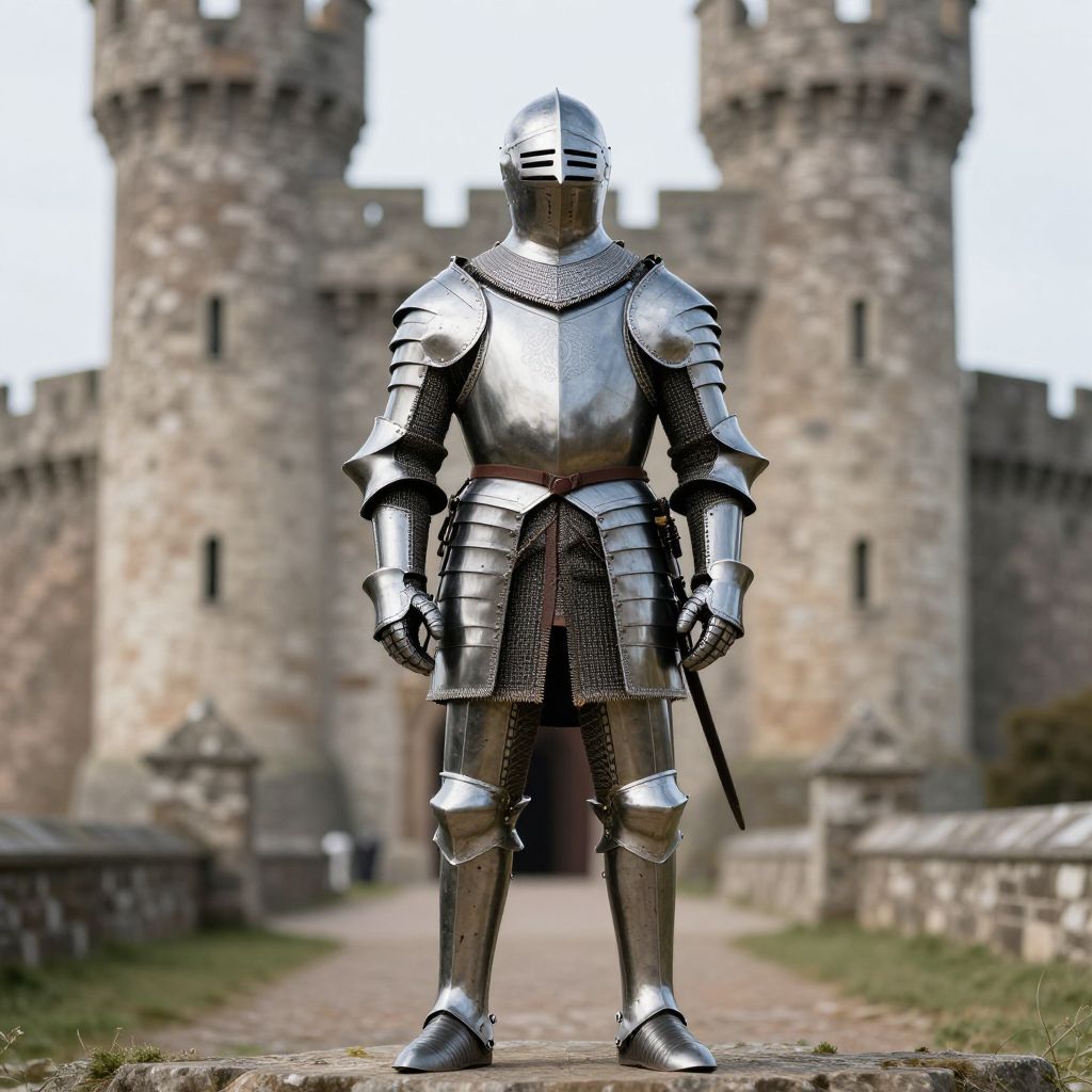 Adult medieval knight costume, knight in full armor standing in front of a castle