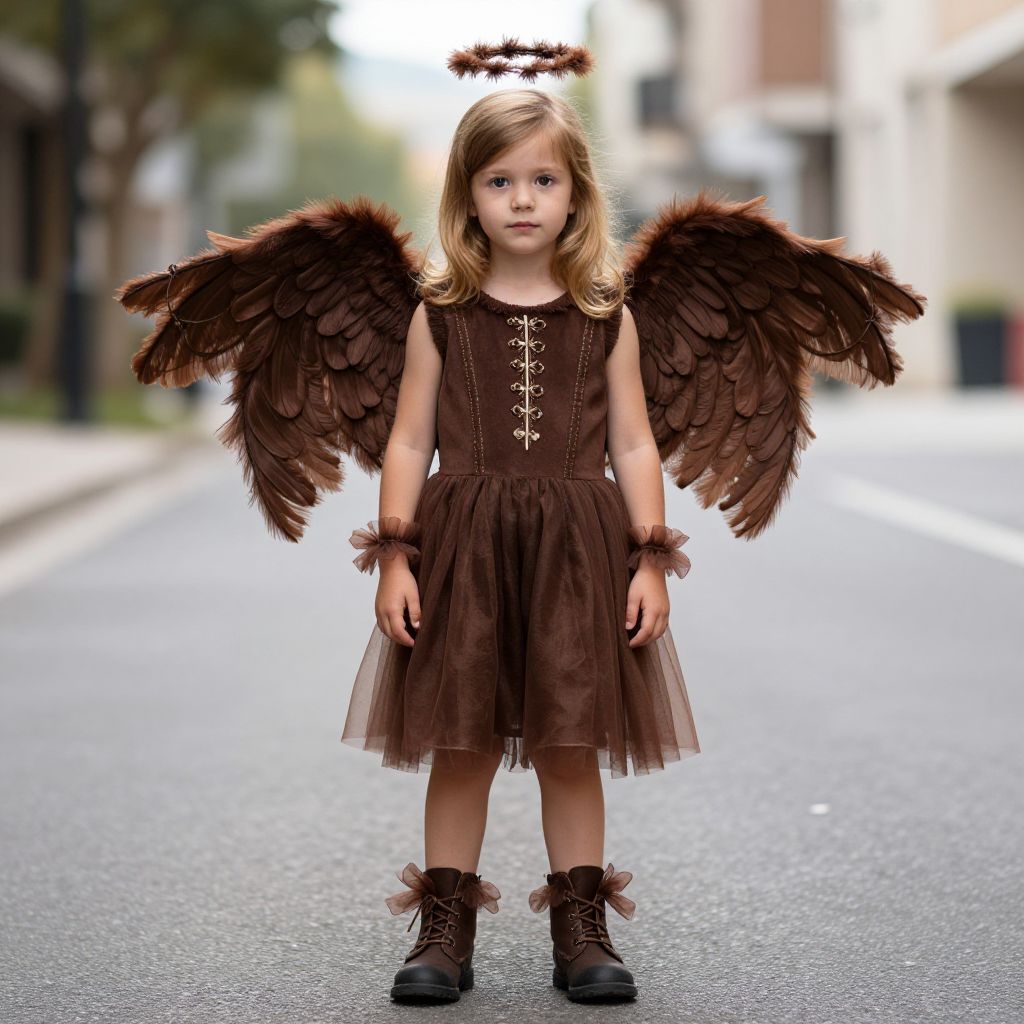 "Twisted Angel Costume, child dressed in a brown angel costume standing on a street"