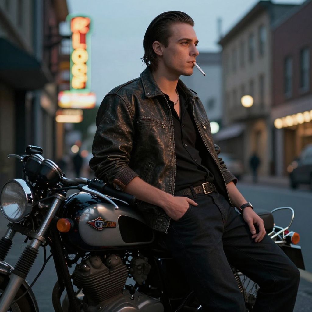 Greaser style young man leaning against a vintage motorcycle on a city street at dusk, leather jacket with rolled-up sleeves, slicked-back hair, cigarette hanging from his lips, neon signs glowing in the background, cinematic moody lighting.