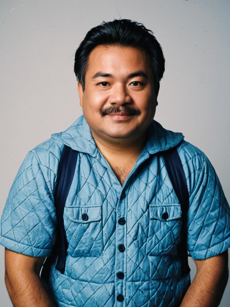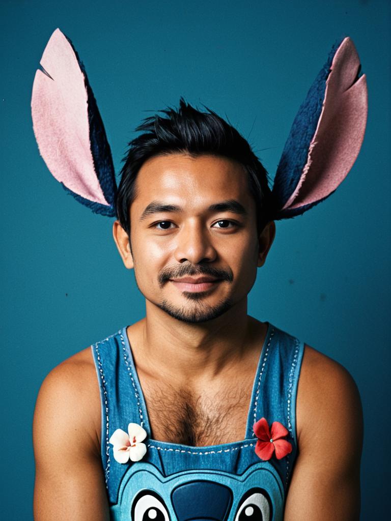 Photorealistic studio headshot of an Asian man with short black hair and a light beard, wearing a blue Lilo Stitch costume tank top adorned with a white and a red flower, and large pink and blue bunny ears headband against a blue background.