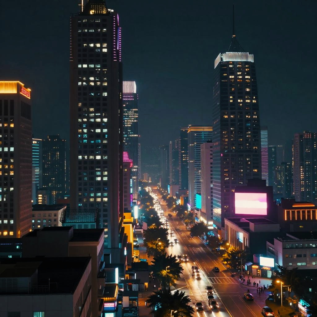 Aesthetic city night with a panoramic view of towering neon-lit towers, dynamic light trails from cars, people silhouettes against multicolored buildings, ambient fog enhancing depth, cyberpunk inspired urban landscape rich in detail and atmosphere