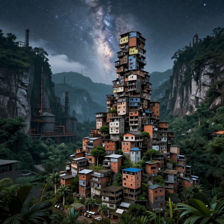 Sci - fi favela sculpture, fantasy jungle environment, industrial factory, cliffs, gloomy, milky way, award winning art, epic dreamlike fantasy landscape, ultra realistic,