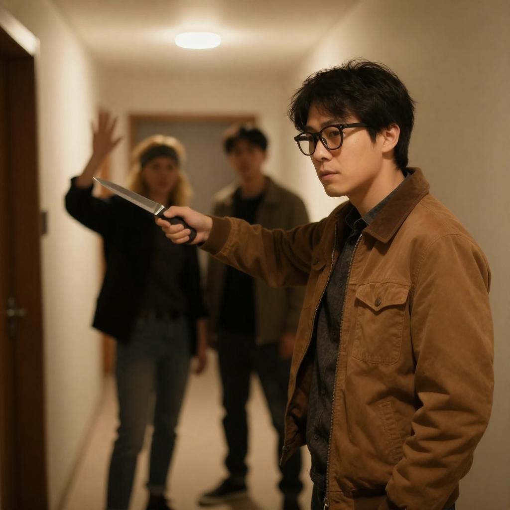 Photograph of a masked man in a dark outfit holding a flashlight, standing in a dimly lit room with blue lighting. A ghostly, translucent figure is on the left. Background includes blurred furniture and a door. The man's face is obscured by shadows and a mask.