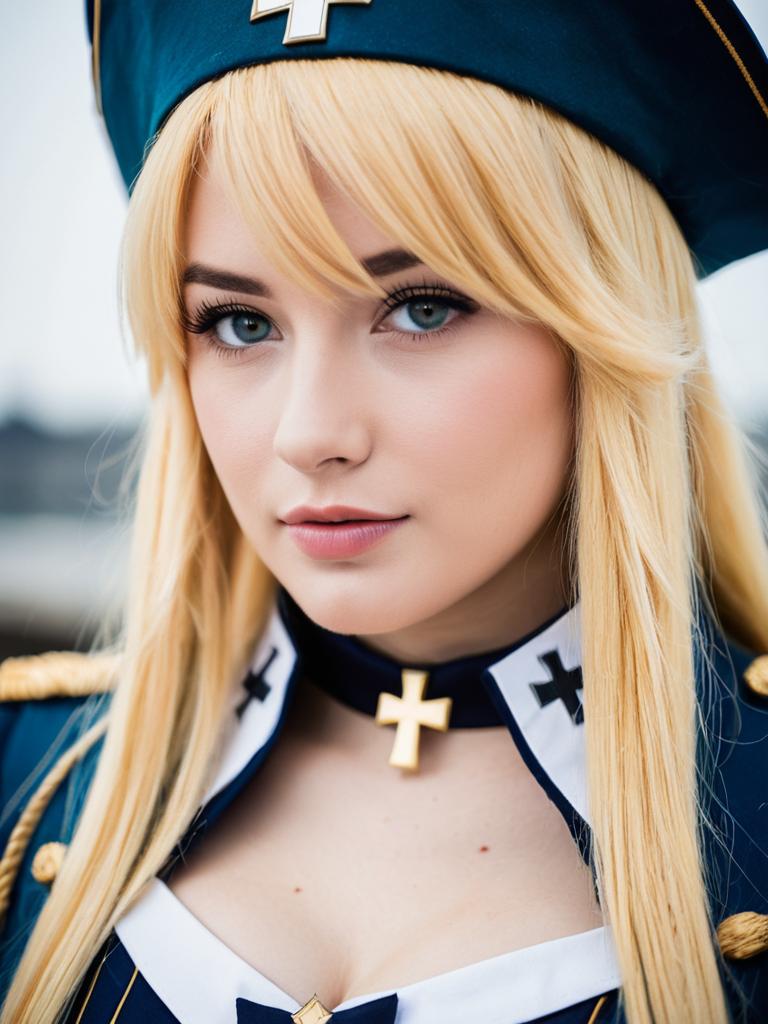 Photo-realistic cosplay photo of person in admiral hipper (azur lane) costume. 1girl, green eyes, hair between eyes, mole under eye, blonde hair, long hair, two side up, ahoge, sidelocks, small breasts, collarbone, iron cross, headgearlifestyle stock photo, shallow depth of field, lifestyle stock photography, shallow depth of field, natural lighting, warm tones, soft background blur, candid moments, vibrant colors, realistic textures, modern casual clothing. full body shot