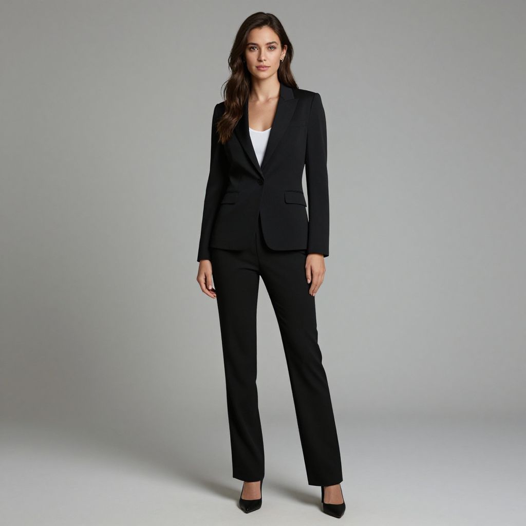 Photograph of a young woman standing against a plain, light gray background. She has long, dark brown hair, parted slightly to the side, and is wearing a black, tailored blazer over a white, V-neck top. She pairs this with black, wide-leg pants and black high-heeled shoes. Her expression is neutral, and she stands with her arms relaxed at her sides. The lighting is even, highlighting the clean lines of her outfit. The overall style is modern and professional.
