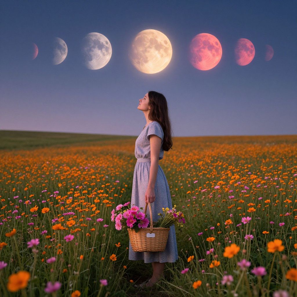 A woman stands amidst a vibrant field of orange and pink wildflowers, holding a basket of freshly gathered blooms, as she gazes upward at a surreal sky filled with seven luminous moons of varying sizes and hues, casting an otherworldly glow over the tranquil landscape.