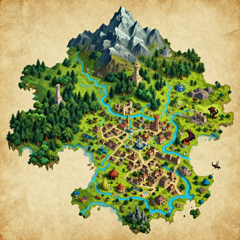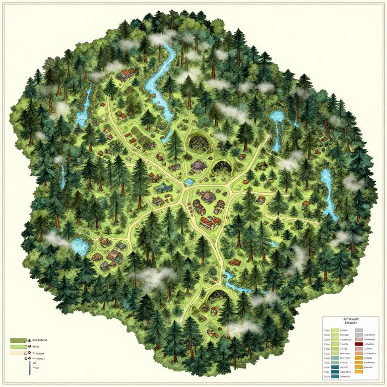 Forest map dnd, a classic hand-painted style topographical fantasy map showcasing a mystical forest terrain with hidden dungeons, enchanted springs, and magical glades, featuring elevation changes, compass rose, and map key for adventure gameplay