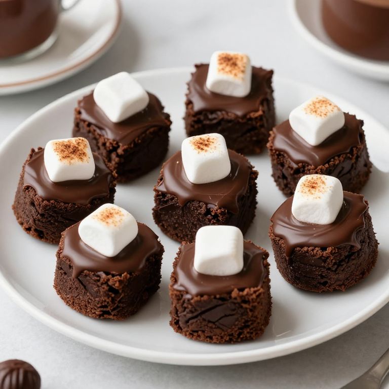 Delicious Hot Chocolate Brownie Cups feature six fudgy, bite-sized brownies arranged neatly on a white plate, each cup filled with a glossy dark chocolate ganache and adorned with three toasted mini marshmallows, creating a delightful and indulgent treat that perfectly captures the essence of a cozy hot chocolate experience.
