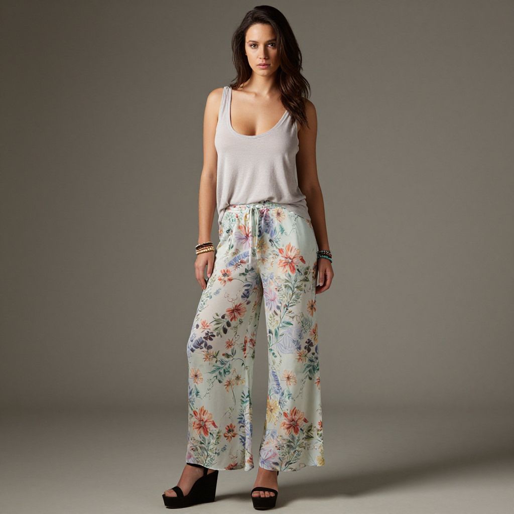 "Woman, casual bohemian, sleeveless light gray tank top, scoop neck, loose fit, floral printed wide-leg pants in pastel tones, drawstring waistband, black open-toe platform sandals, layered bracelets, studio with a neutral gray backdrop.. Sexy. Pretty face and beаutiful eyes. Big breasts."
