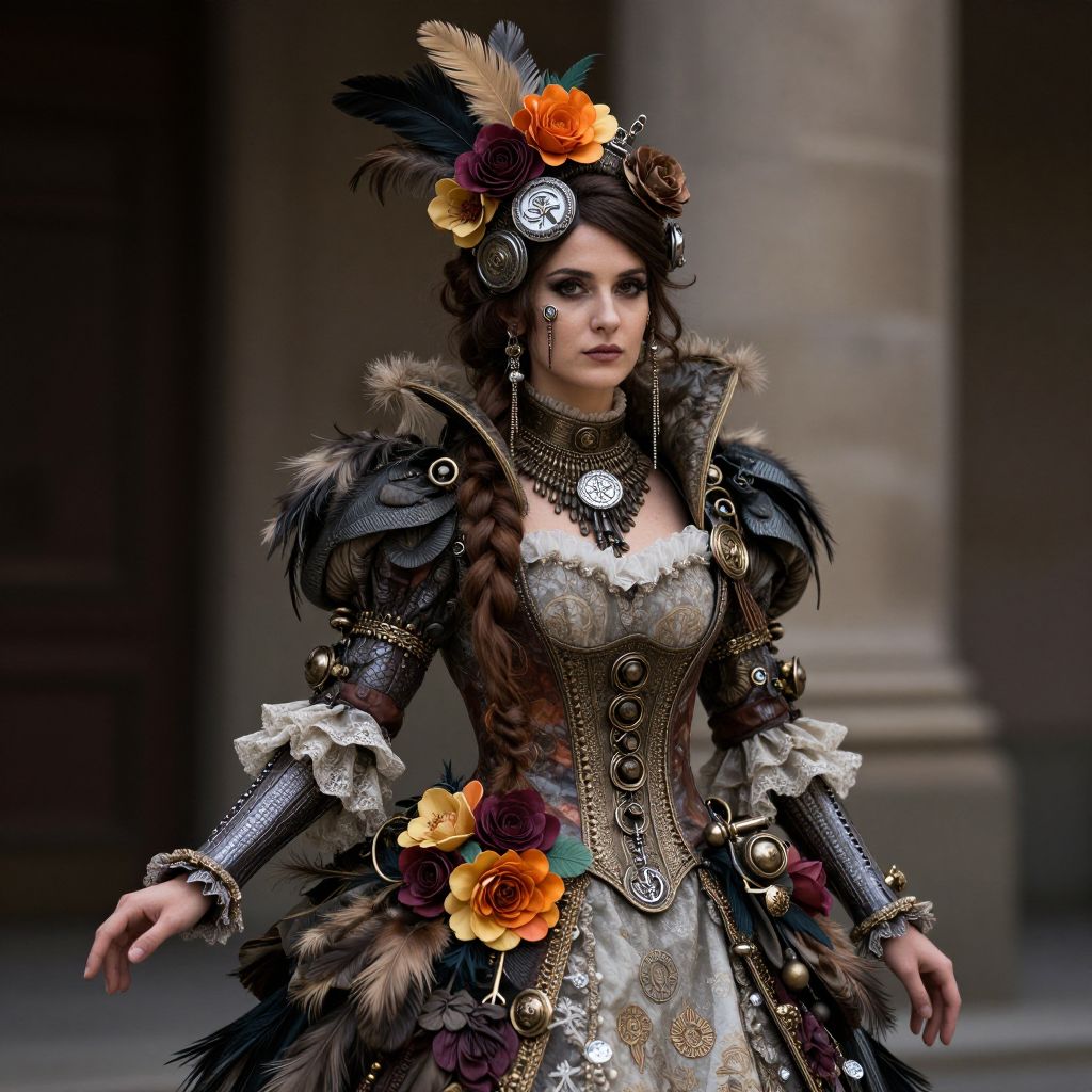A steampunk woman adorned with intricate details, featuring feathers and flowers in her elaborate dress and headpiece.