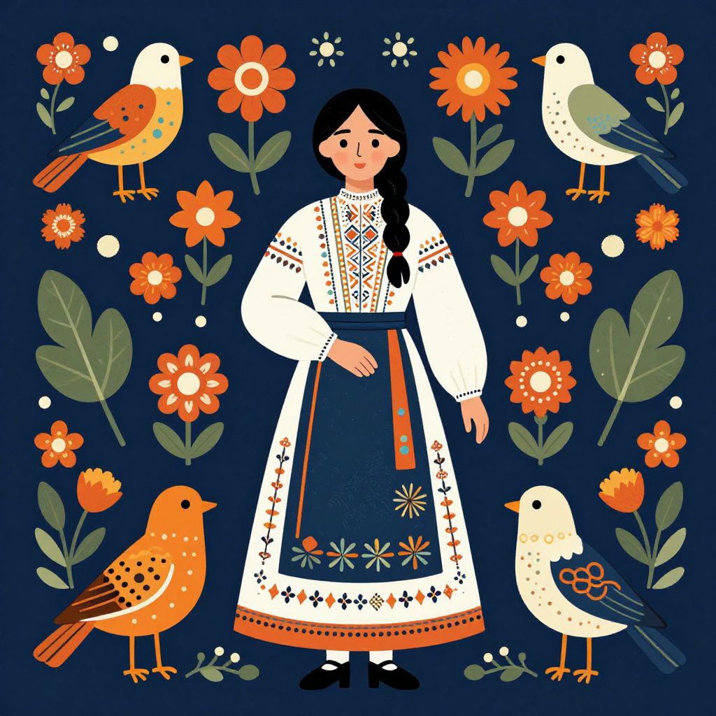 Digital illustration of a young woman in a traditional white and blue embroidered dress surrounded by colorful birds and orange flowers on a dark blue background.