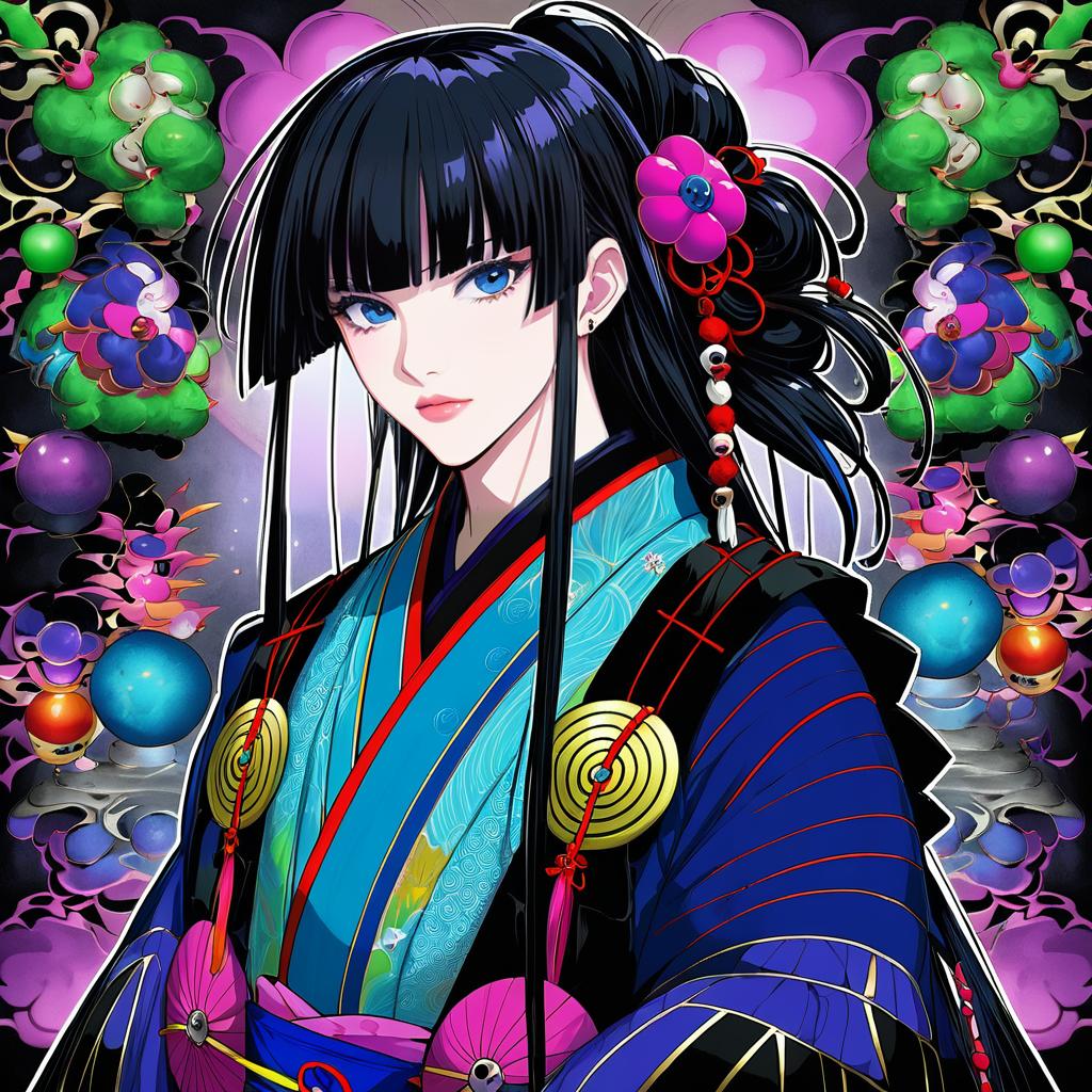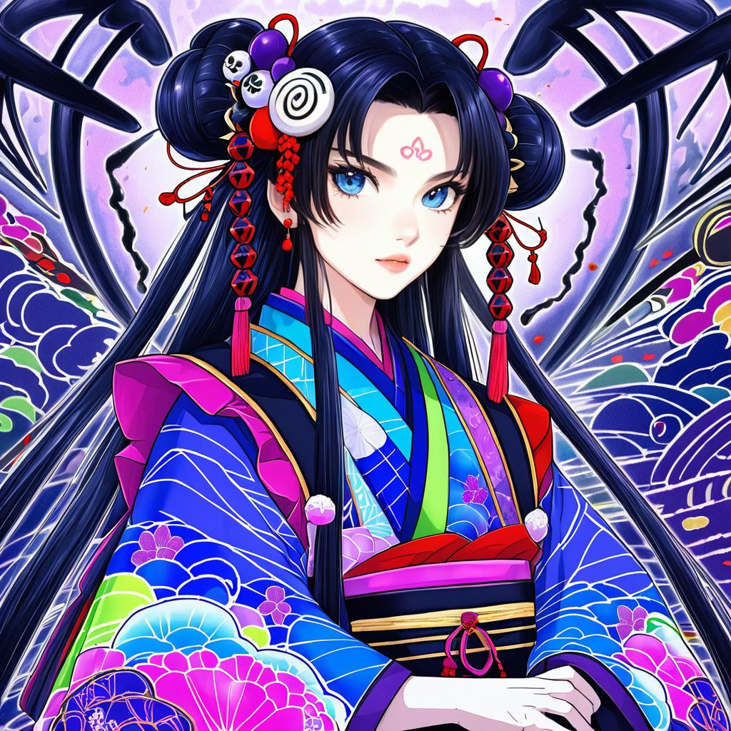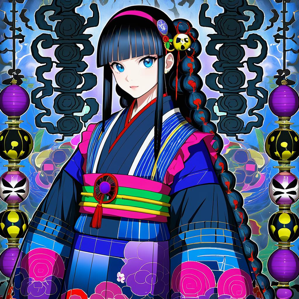 Alluka zoldyck, hunter x hunter, 1boy, blue eyes, black hair, long hair, multi-tied hair, blunt bangs, hair ornament, hairband, japanese clothes, multicolored dress, long sleeves, wide sleeves, by artist dean (momodean), anime