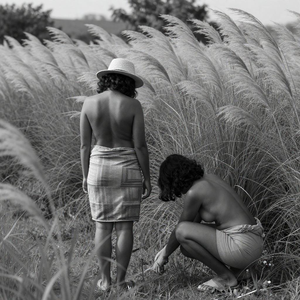Black and white photograph of two people in a grassy field with tall pampas grass. One person stands with back to camera, wearing a hat and sarong, while the other crouches, bent over, near the center-right. Both have dark hair. The standing person's back is bare. Tall grass sways in the wind, covering the background.