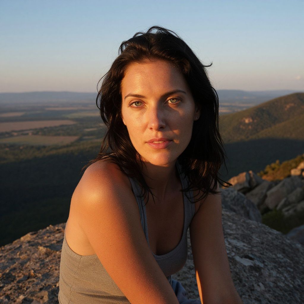 Craft a photorealistic portrait with DSLR precision, capturing a Western European woman's close-up against a backdrop of untamed nature. Her sun-kissed skin and hazy green eyes contrast her raven hair, illuminated by warm sunset hues. From an intriguing worm's-eye view, she sits atop a rocky outcrop, overlooking a vast landscape stretching towards the horizon. The scene exudes tranquility yet intensity; soft golden light caresses her face while distant mountain shadows add depth to the composition.