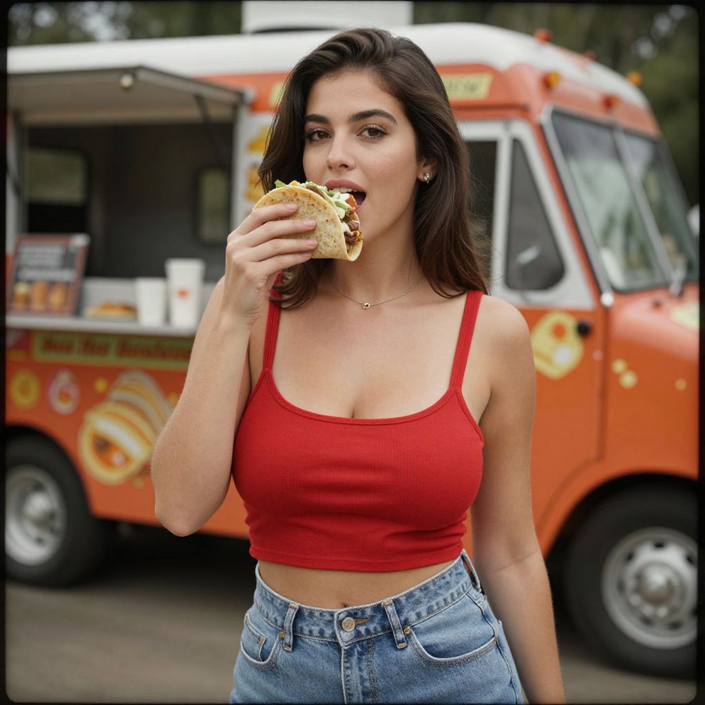 Photograph of a young woman with long dark brown hair and fair skin, wearing a tight red tank top that reveals a moderate cleavage and high-waisted blue jeans. She is standing outdoors, biting into a sandwich with her right hand. Behind her, an orange food truck with white and yellow accents is visible, with its window showing a menu. The food truck is slightly blurred, emphasizing the woman as the focal point. She has a subtle smile and is wearing a delicate necklace. The background includes some greenery, indicating an outdoor setting. The image has a slight vintage filter with a black border.