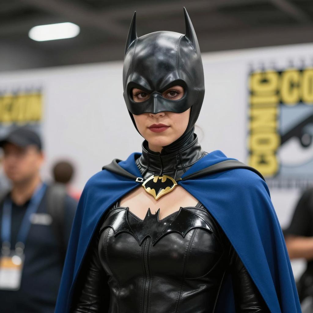 A woman dressed as Batgirl, specifically the character Barbara Gordon from DC Comics, embodies the superhero spirit with intricate cosplay at a comic convention. The costume features the classic color combination of black and blue, showcasing the iconic mask and cape in a captivating artistic style.