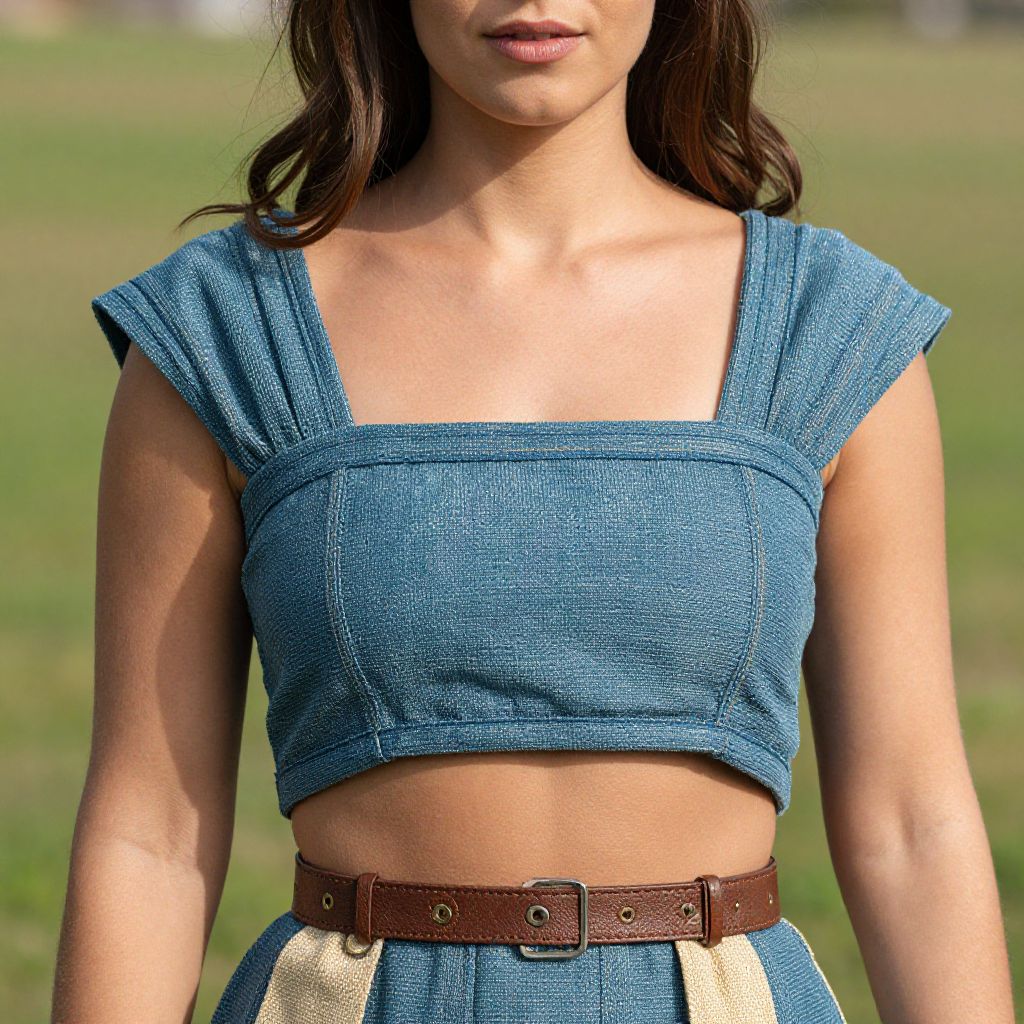 Photograph of a young woman from the chest to just below the waist, standing outdoors in a grassy field. She has medium brown, wavy hair that falls to her shoulders and is wearing a blue, textured, square-shoulder crop top with short sleeves. Her midriff is exposed, showcasing a slim, toned physique. She also wears high-waisted, blue-and-beige patterned pants, cinched with a brown leather belt featuring metal buckles. The background is blurred, highlighting the green grass. The lighting is natural, casting soft shadows.