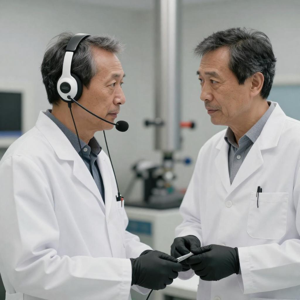 Photograph of a middle-aged man with light skin wearing a beige shirt, looking through a black and silver autorefractor device with multiple spherical lenses covering his eyes. The background is plain white, emphasizing the device and the man's face. The man's expression is neutral, and the device is centered in the frame.