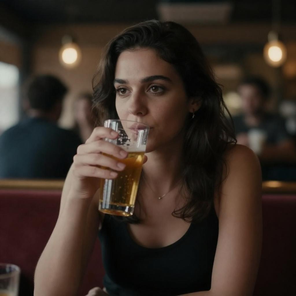 Photograph of a woman with dark hair in a black top, holding a glass of beer, sitting in a dimly lit bar. Blurred background includes people, string lights, and red upholstered seats. She has a focused expression, and the image has a warm, slightly grainy ure.
