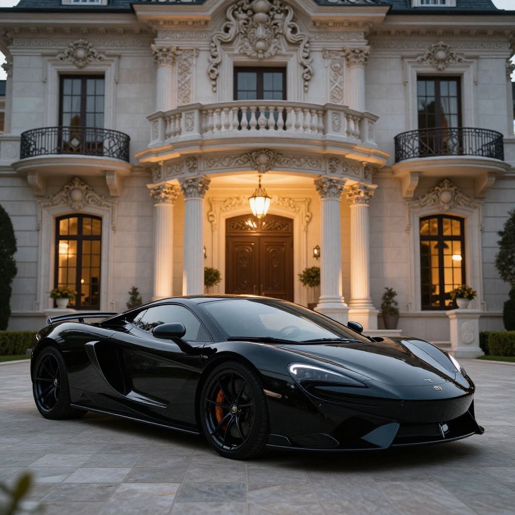 The image presents a luxurious and hyper-detailed scene, exuding an aura of wealth and opulence. A sleek, matte black sports car is prominently positioned in the foreground, its modern design contrasting with the grandeur of the background. The car's aerodynamic curves and sharp lines are accentuated by the high-resolution, high-dynamic-range (HDR) lighting, which highlights its metallic finish and intricate details. Behind the car, a grand, classical mansion stands majestically, its architectural elements meticulously crafted. The building features ornate columns, elaborate balconies, and a richly decorated entrance, all bathed in warm, inviting light that contrasts with the cool tones of the car. The interplay of light and shadow creates a dramatic effect, emphasizing the texture and depth of the materials used in both the car and the mansion. The overall composition is balanced, with the car and the mansion occupying central positions, their spatial relationship suggesting a harmonious coexistence of modern luxury and classical elegance. The scene is devoid of any human presence, allowing the viewer to fully appreciate the grandeur and sophistication of the setting.