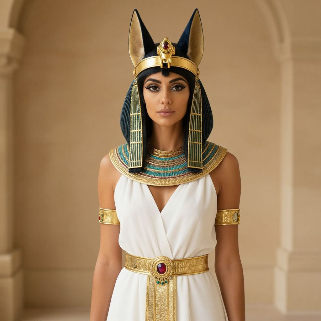 "Woman Bastet Egyptian Goddess Costume, a woman in a white dress and a gold headpiece"