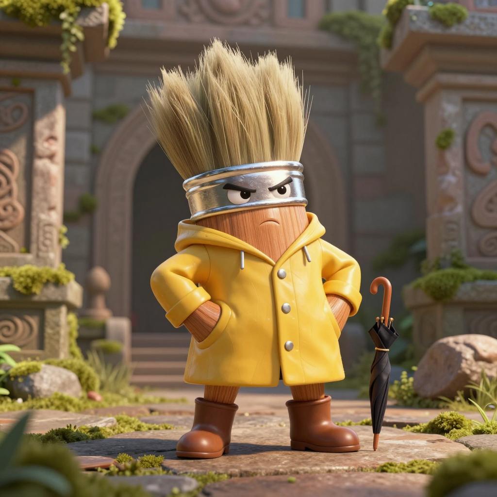 Anthropomorphic paintbrush artist hero character with smooth polished wood with carved joints body, raincoat, boots, and tiny umbrella, determined and slightly grumpy expression, hands on hips in a victorious stance in ancient temple courtyard overgrown with moss, under dramatic rim lighting with strong shadows, bright and cartoony with chunky shapes, highly detailed, dynamic composition, 8k render