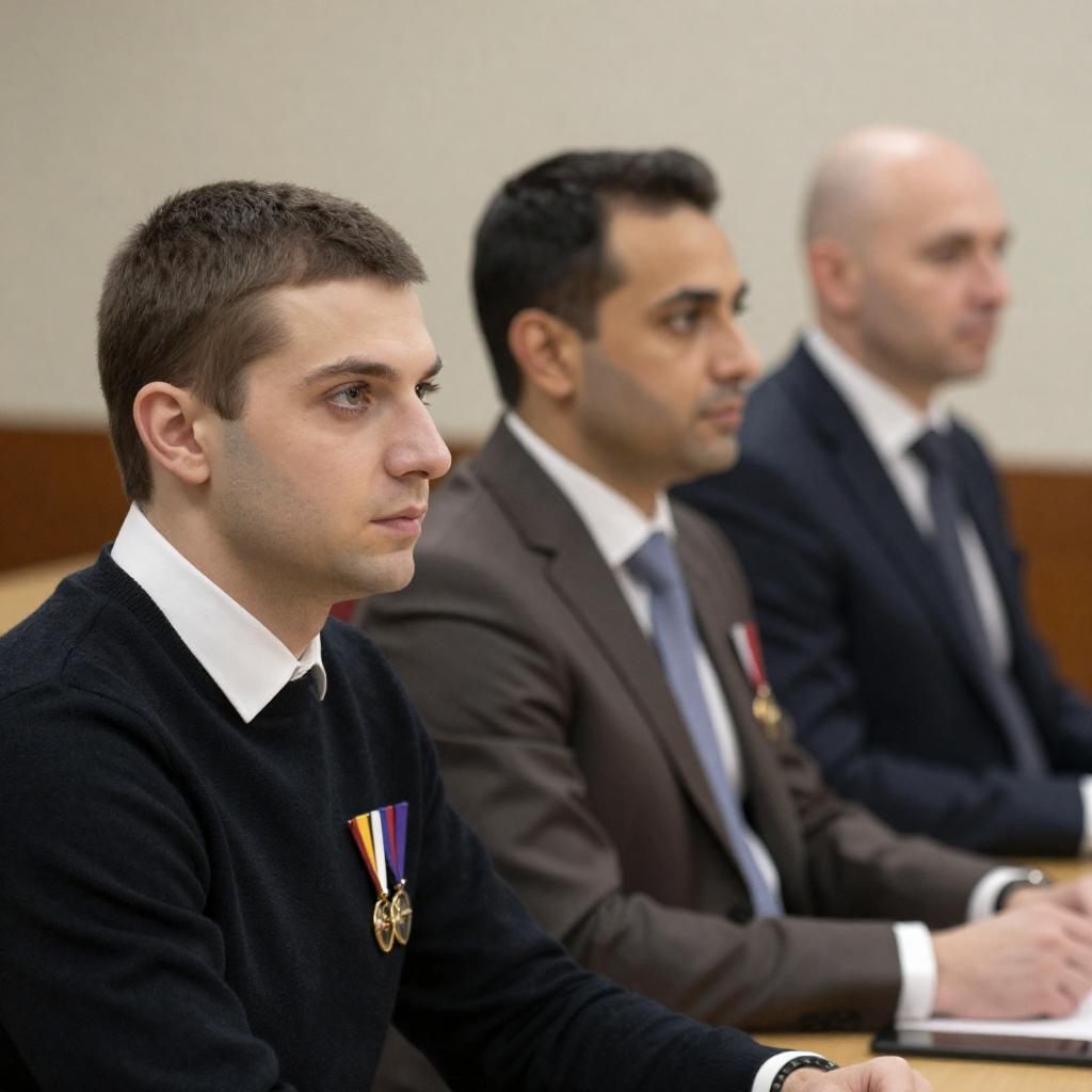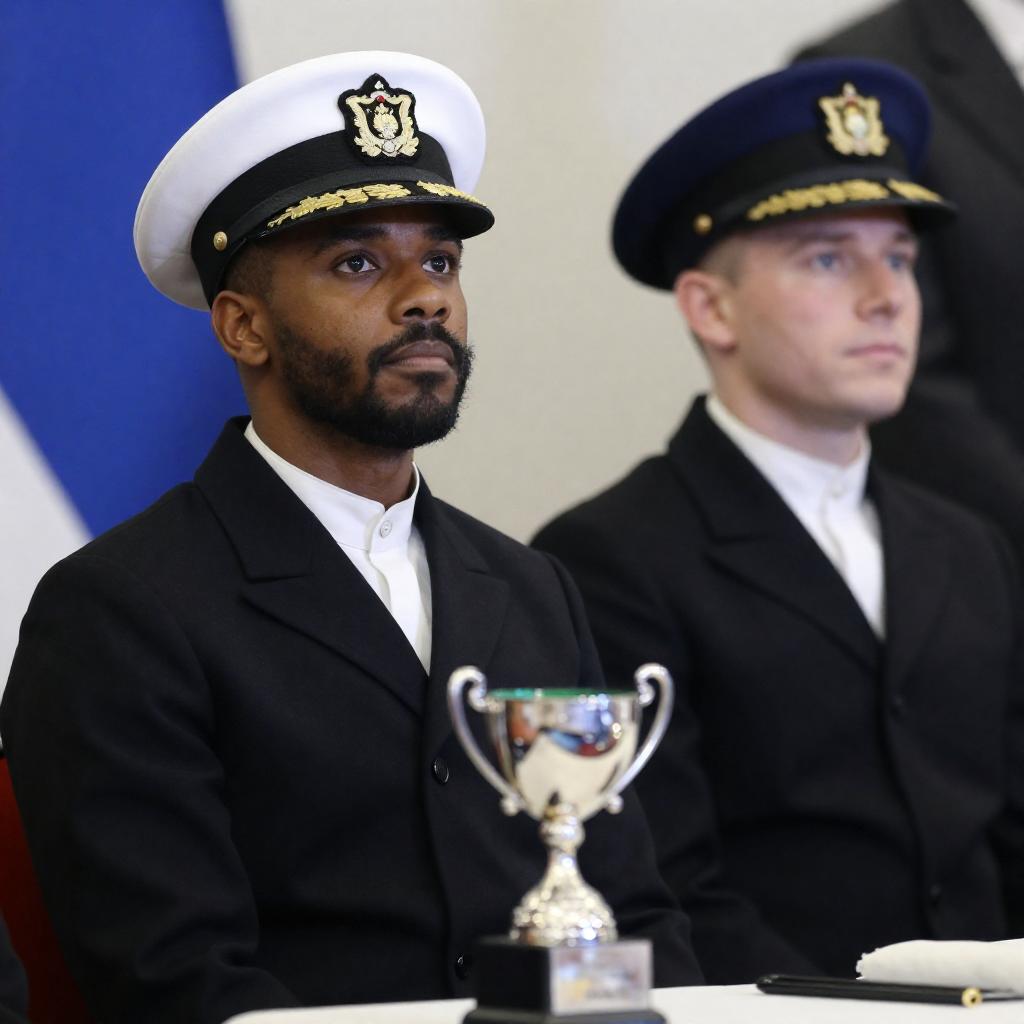 Photograph of two men in naval uniforms, sitting side by side. The man in the foreground has dark skin, black hair, and a beard, wearing a white cap with a black emblem. He looks up with a serious expression. The man in the background has light skin, short blond hair, and wears a blue cap with a gold emblem, looking slightly to the right. Between them, a silver trophy with a green top is placed on a white cushioned seat. Both men wear black jackets with white collars.