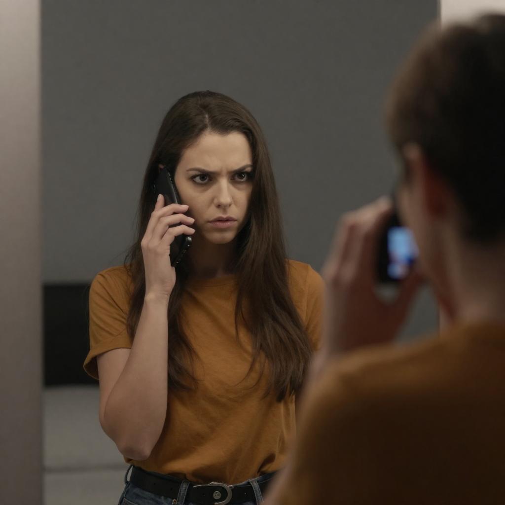 Woman with long brown hair, intense expression, holding black phone to ear, wearing orange shirt, reflected in mirror. Man with short brown hair, back to camera, holding camera, foreground. Dimly lit room.
