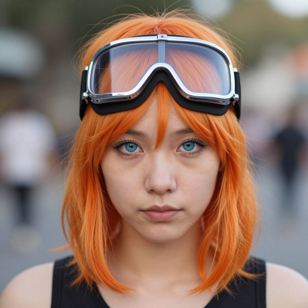 "jobu tupaki halloween, solo, blurry background, looking at viewer, blurry, 1girl, outdoors, goggles, blue eyes, orange hair, closed mouth Realistic photo of casual sexy person with pretty face"