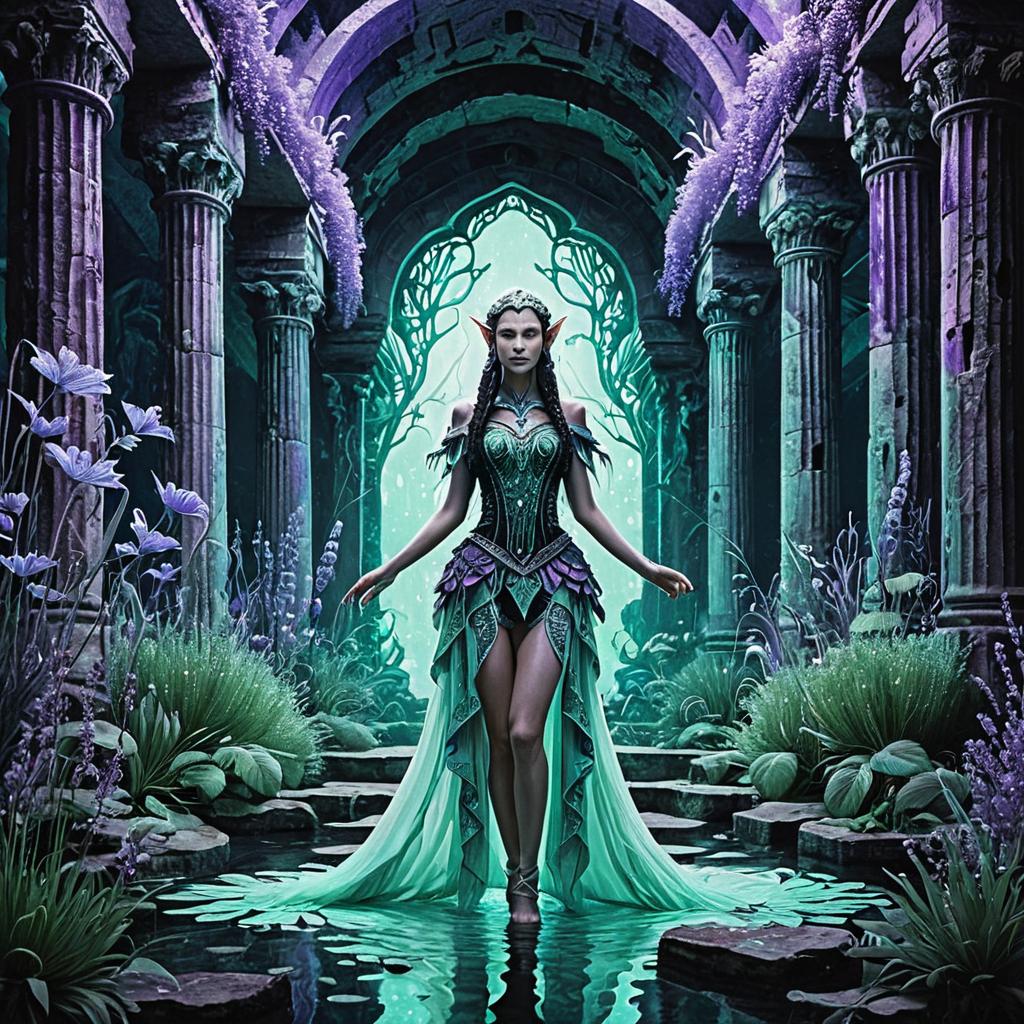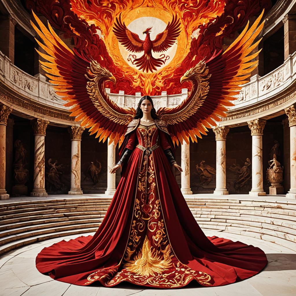 A phoenix draped in elaborate embroidery glides through frozen crystal palace in a fiery red and icy blue palette, with psychedelic graphic design and angelcore elegance overlaid with scientific illustration motifs in ultra-high-definition 3840×2160.
