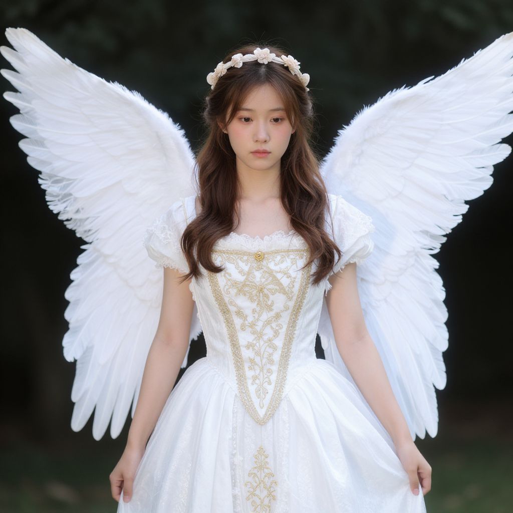 Photograph of an East Asian woman with long, wavy brown hair wearing a white, lace-trimmed, short-sleeved dress adorned with gold embroidery. She has large, white feathered angel wings extending from her back and a delicate pink flower crown on her head. Her expression is neutral, and she stands against a dark, blurred forest background, creating a stark contrast with her bright white attire. The image emphasizes her ethereal, angelic appearance.