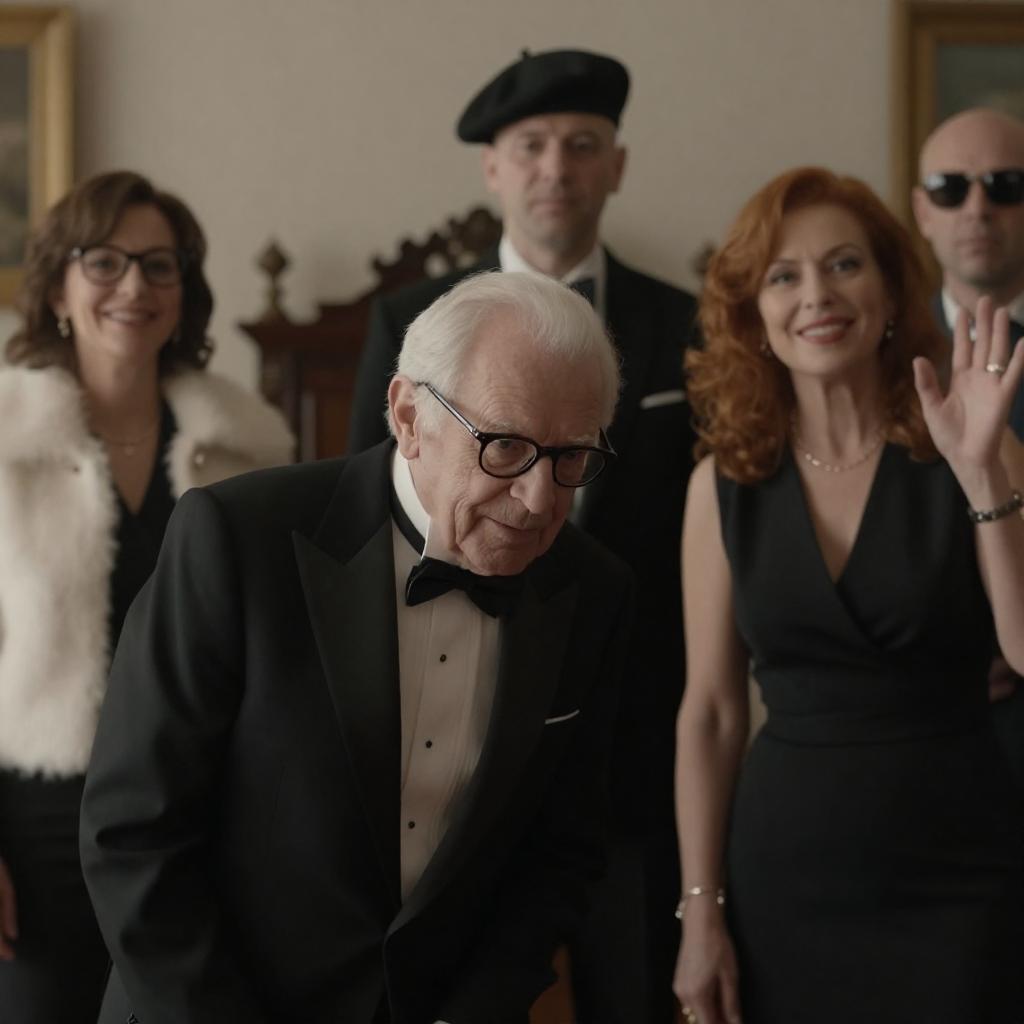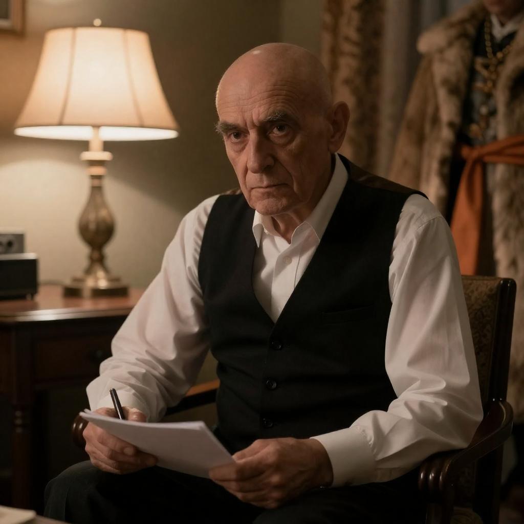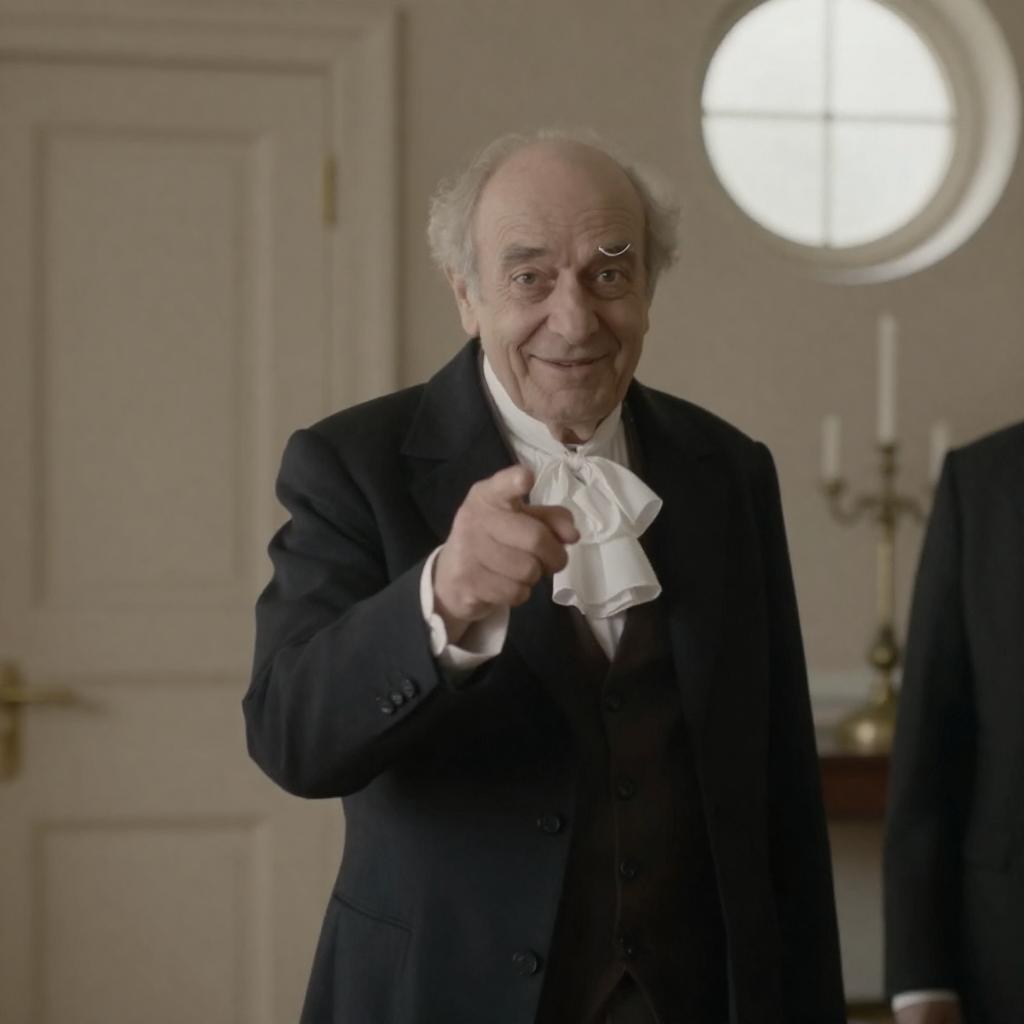 Old man with balding gray hair, white ruffled shirt, black coat, pointing finger, smiling, indoors, beige walls, door, candle holder, round window, another person partially visible on the right.