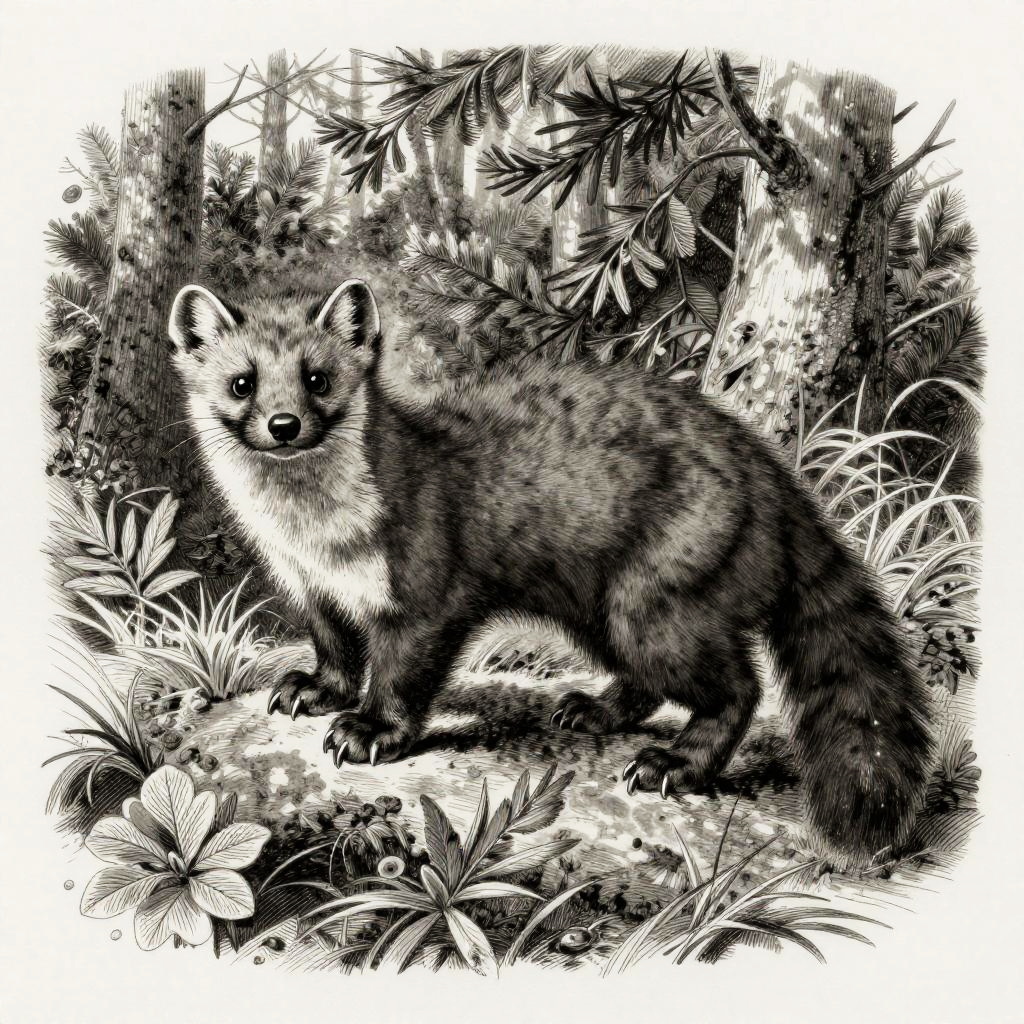 A detailed monochrome engraving depiction of a pine marten climbing, set in dense conifer forest with dappled light, realistic fur texture, intricate crosshatching and line shading, black and white palette, precise natural anatomy and rosette patterns, high-contrast chiaroscuro with deep blacks and crisp highlights, balanced composition, dynamic negative space, directional strokes suggesting motion, subtle ink bleed and paper grain, museum illustration aesthetic, archival print texture, timeless graphic character