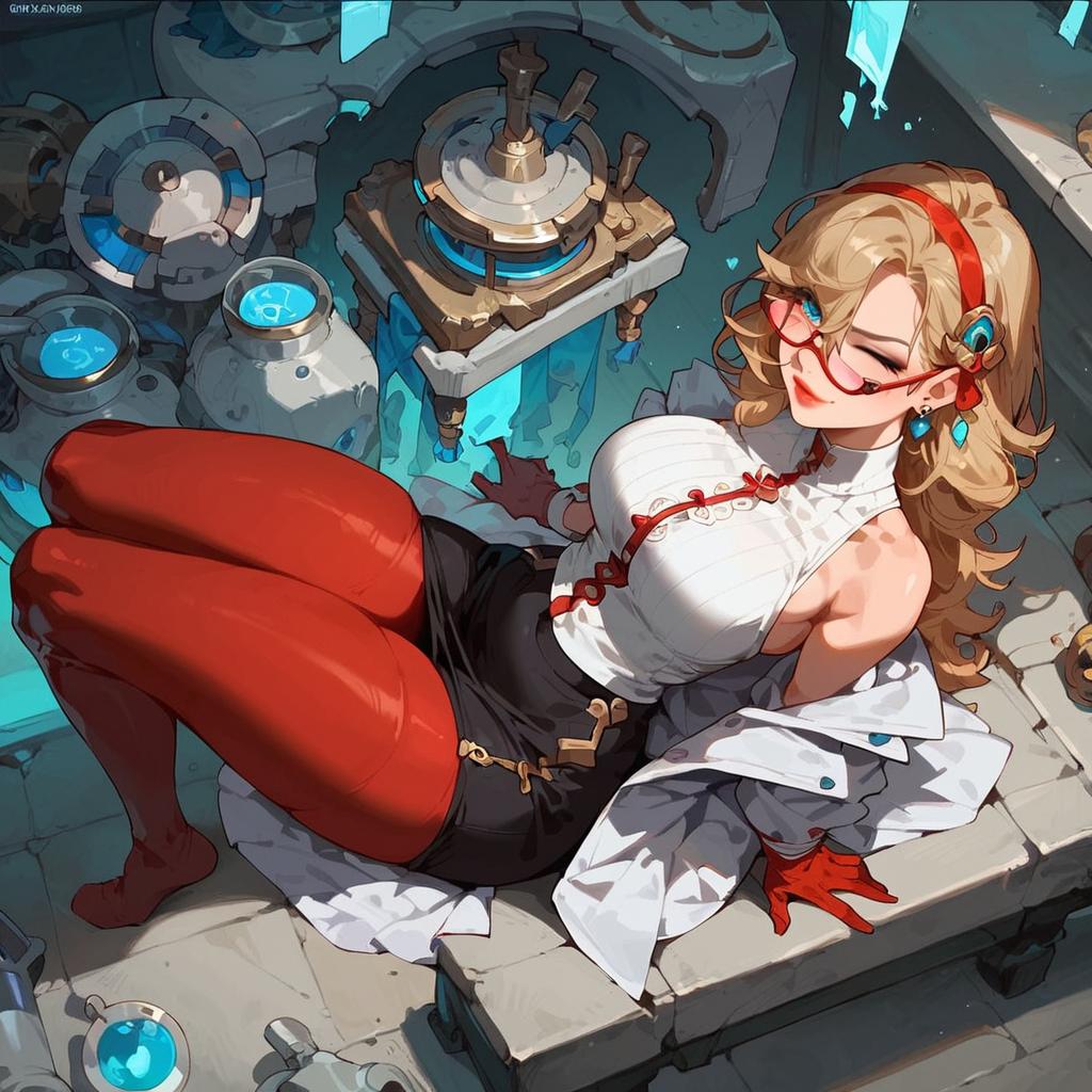 Digital artwork of a fantasy female character sitting in a laboratory setting surrounded by potions and scientific equipment. She has long blonde hair with a red headband and hair ornament, wears red glasses, a sleeveless white shirt with red accents, a black skirt, red leggings, red gloves, and a white coat. The character has wide hips, thick thighs, and a confident, smug expression. The scene is viewed from above, highlighting the detailed fantasy laboratory environment with glowing blue liquids.