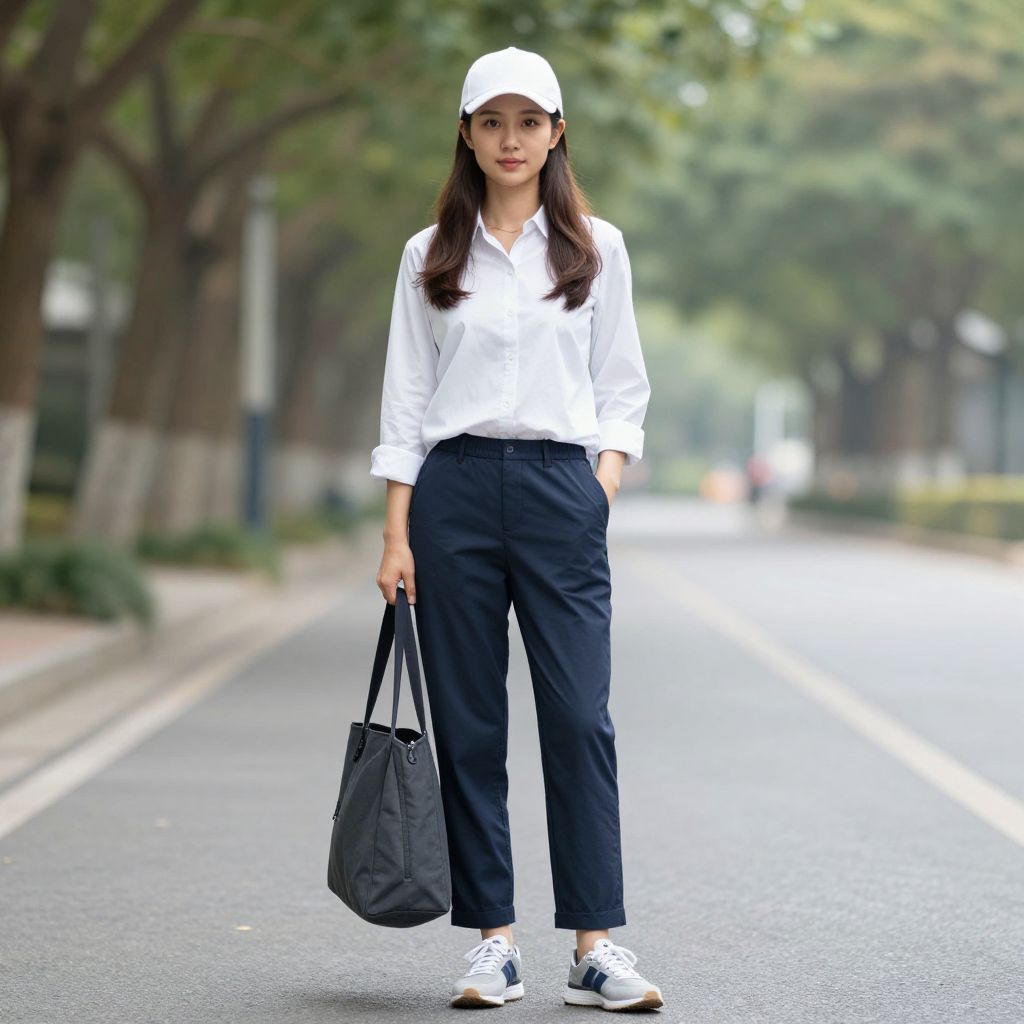 Full-body portrait of an Asian woman standing on a street outdoors with a blurred background. She has long brown hair, brown eyes, and wears a white button-up shirt with rolled-up sleeves, navy blue pants, white and blue sneakers, and a white baseball cap. She is holding a black tote bag in one hand while her other hand is in her pocket, looking directly at the camera.