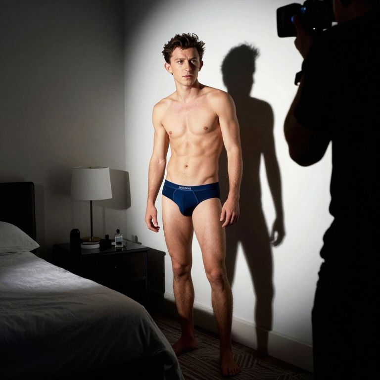 Light And Shadow paparazzi photograph of Tom Holland in Hanes briefs interior of a New York flat bedroom, flash photography, caught, full-body,