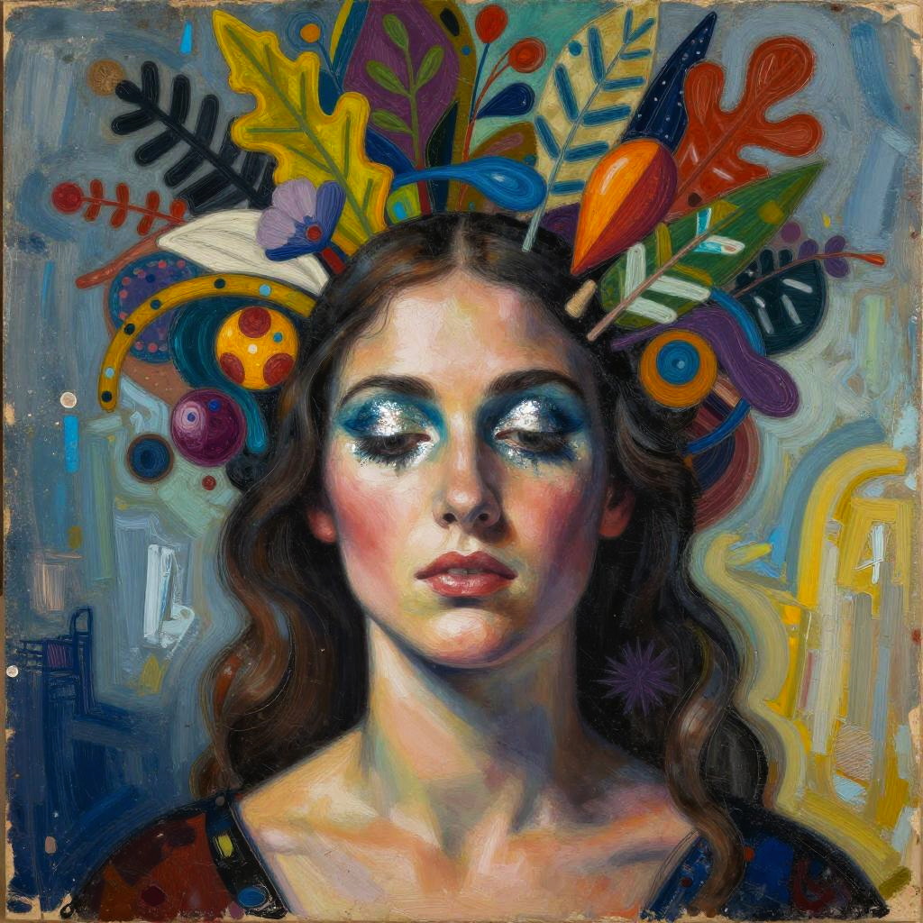 Vibrant, abstract expressionist painting of a woman with short brown hair, wearing a glowing, swirling, neon-colored dress, set against a dynamic