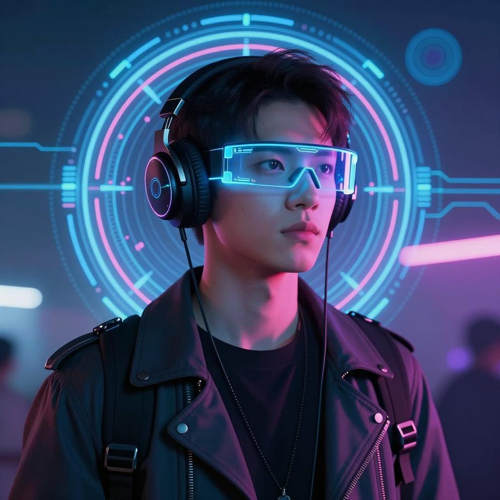 Futuristic Cyberpunk Man with Neon Glasses and Headphones