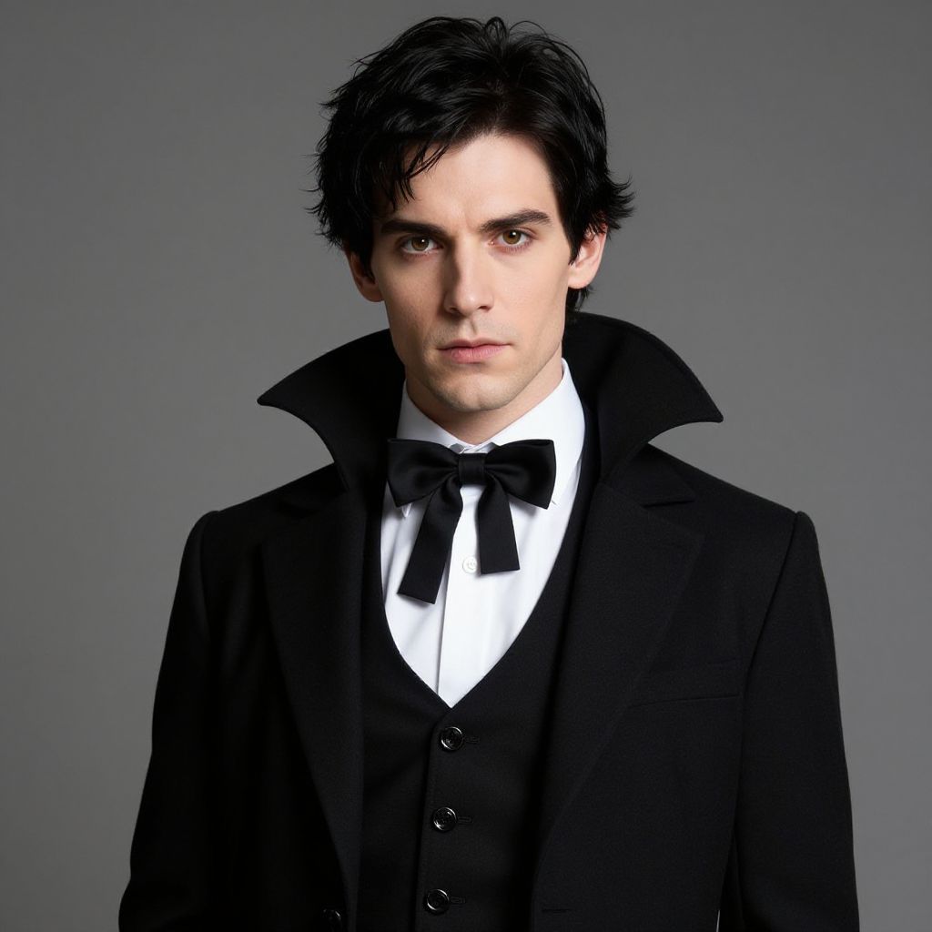 Photograph of a pale-skinned, young Caucasian man with dark, wavy hair and intense brown eyes. He wears a black, formal Victorian-style outfit with a high-collared black coat, white dress shirt, and black bow tie. The coat's collar is dramatically open. The background is a simple, gradient gray, putting emphasis on the subject. His expression is serious and slightly melancholic, with minimal makeup. The lighting is soft, highlighting his facial features and the texture of his coat. The overall style is reminiscent of Gothic or Victorian fashion.