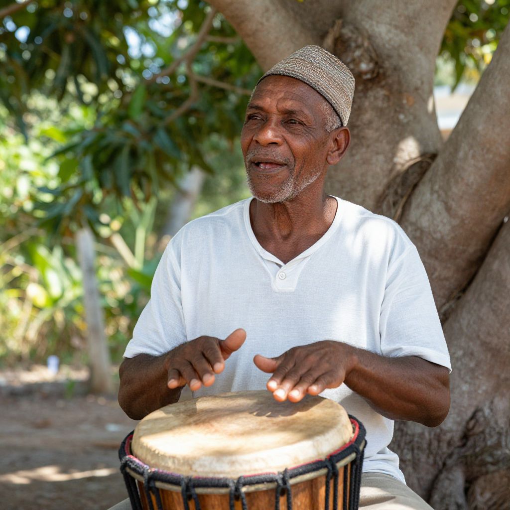 Photograph of an elderly Black man with a brown skin tone, wearing a white shirt and beige cap, playing a wooden drum outdoors under a large tree