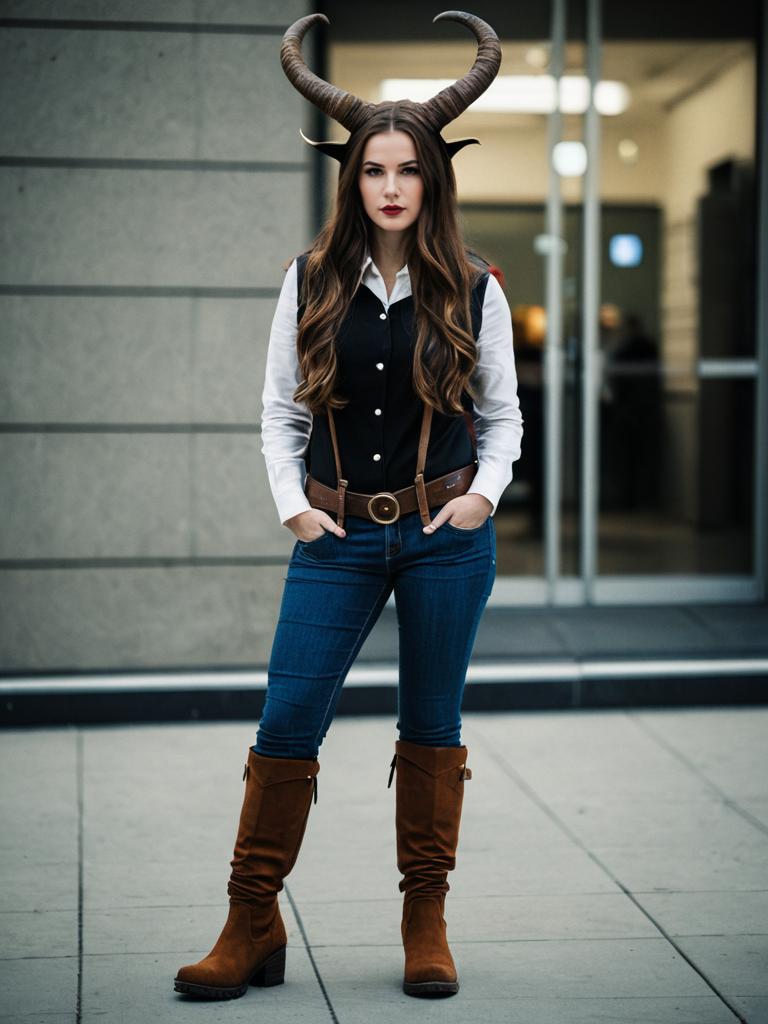 Full body portrait of a woman with long brown hair wearing a costume with large faux horns on her head. She is dressed in a white long sleeve shirt, black vest, blue jeans, brown suspenders, and knee-high brown boots. She stands confidently with hands in pockets in an urban outdoor setting in front of a modern building.